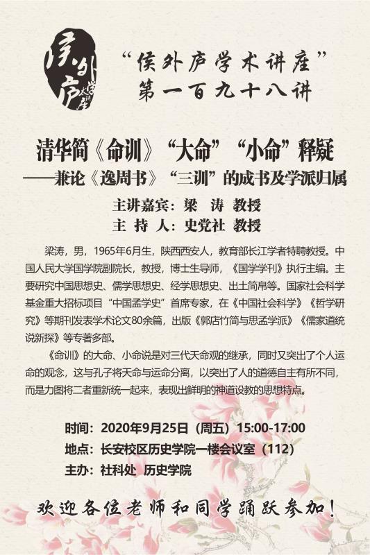 梁涛 教授 侯外庐学术讲座第一百九十八讲:清华简《命训》“大命”“小命”释疑 ——兼论《逸周书》“三训”的成书及学派归属 讲座时间 2020年9月25日(周五)15:00-17:00 讲座地点 长安校区历史学院一楼会议室(112) 讲座人介绍 梁涛 教授 讲座内容