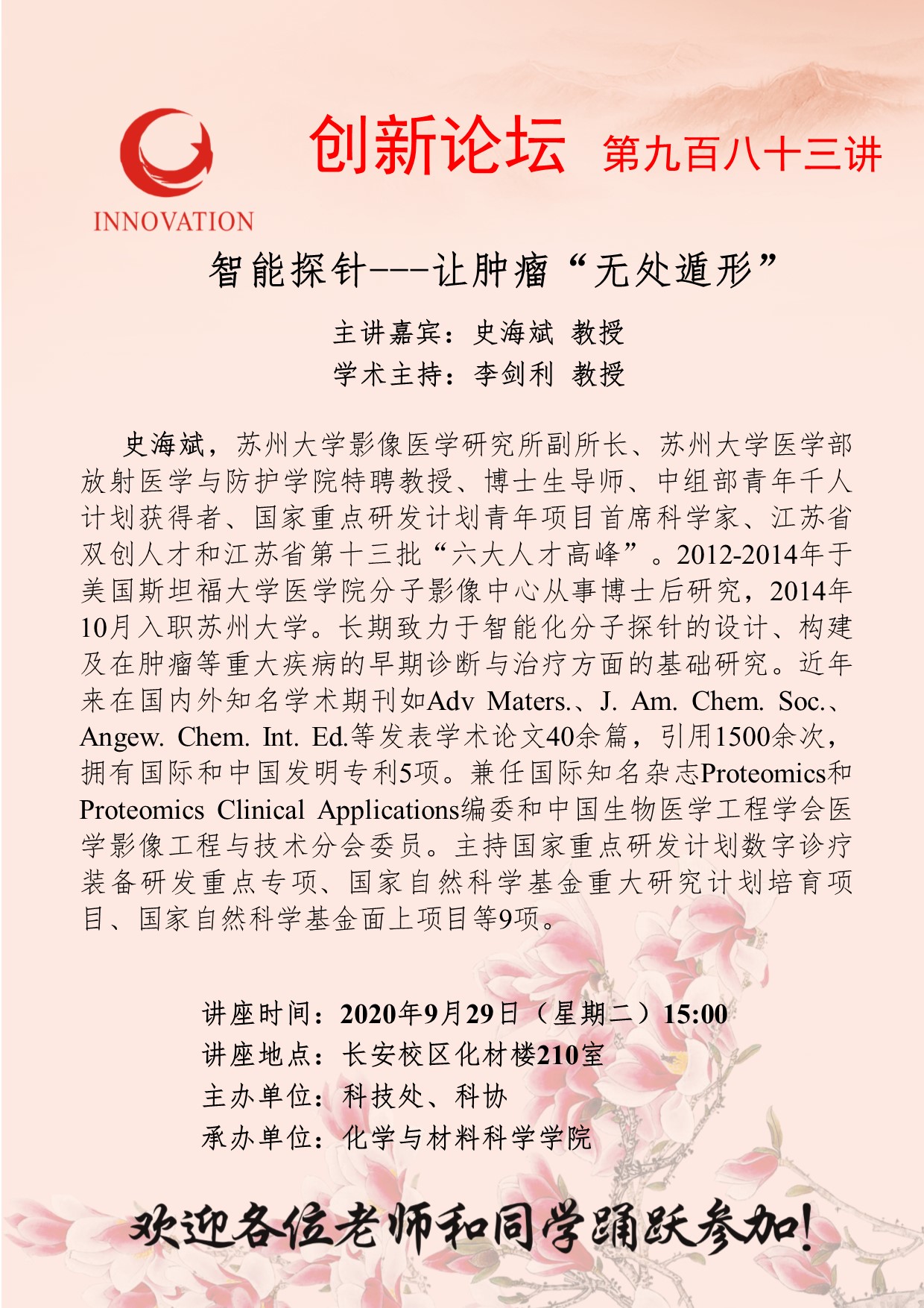 史海斌 教授 米兰网页版·官方端在线创新论坛第九百八十三讲:智能探针---让肿瘤“无处遁形” 讲座时间 2020年9月29日(星期二)15:00 讲座地点 长安校区化材楼210室 讲座人介绍 史海斌 教授 讲座内容