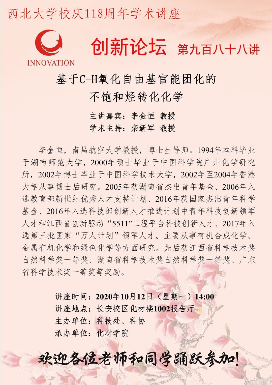 李金恒 教授 米兰网页版·官方端在线创新论坛第九百八十八讲暨校庆118周年学术讲座:基于C-H氧化自由基官能团化的不饱和烃转化化学 讲座时间 2020年10月12日(星期一)14:00 讲座地点 长安校区化材楼1002报告厅 讲座人介绍 李金恒 教授 讲座内容