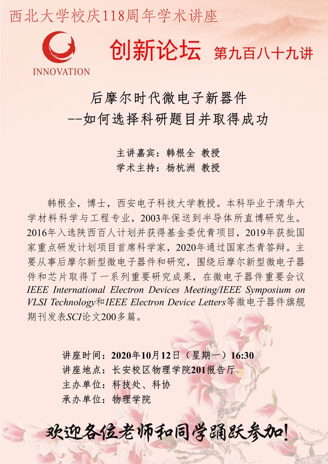 韩根全 教授 米兰网页版·官方端在线创新论坛第九百八十九讲暨校庆118周年学术讲座:后摩尔时代微电子新器件--如何选择科研题目并取得成功 讲座时间 2020年10月12日(星期一)16:30 讲座地点 长安校区物理学院201报告厅 讲座人介绍 韩根全 教授 讲座内容