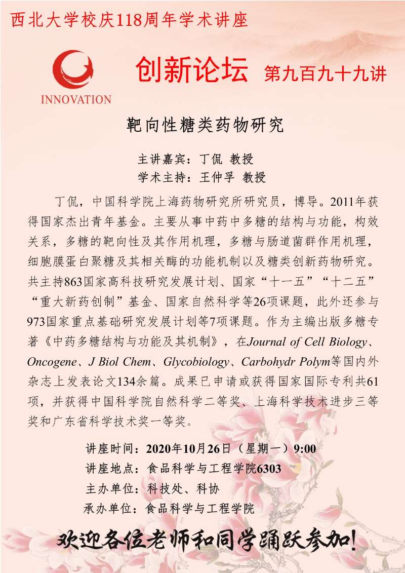 丁侃 教授 米兰网页版·官方端在线创新论坛第九百九十九讲暨校庆118周年学术讲座:靶向性糖类药物研究 讲座时间 2020年10月26日(星期一)9:00 讲座地点 食品科学与工程学院6303 讲座人介绍 丁侃 教授 讲座内容