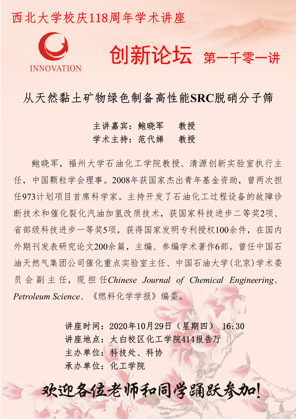鲍晓军 教授 米兰网页版·官方端在线创新论坛第一千零一讲暨校庆118周年学术讲座:从天然黏土矿物绿色制备高性能SRC脱硝分子筛 讲座时间 2020年10月29日(星期四) 16:30 讲座地点 太白校区化工学院414报告厅 讲座人介绍 鲍晓军 教授 讲座内容