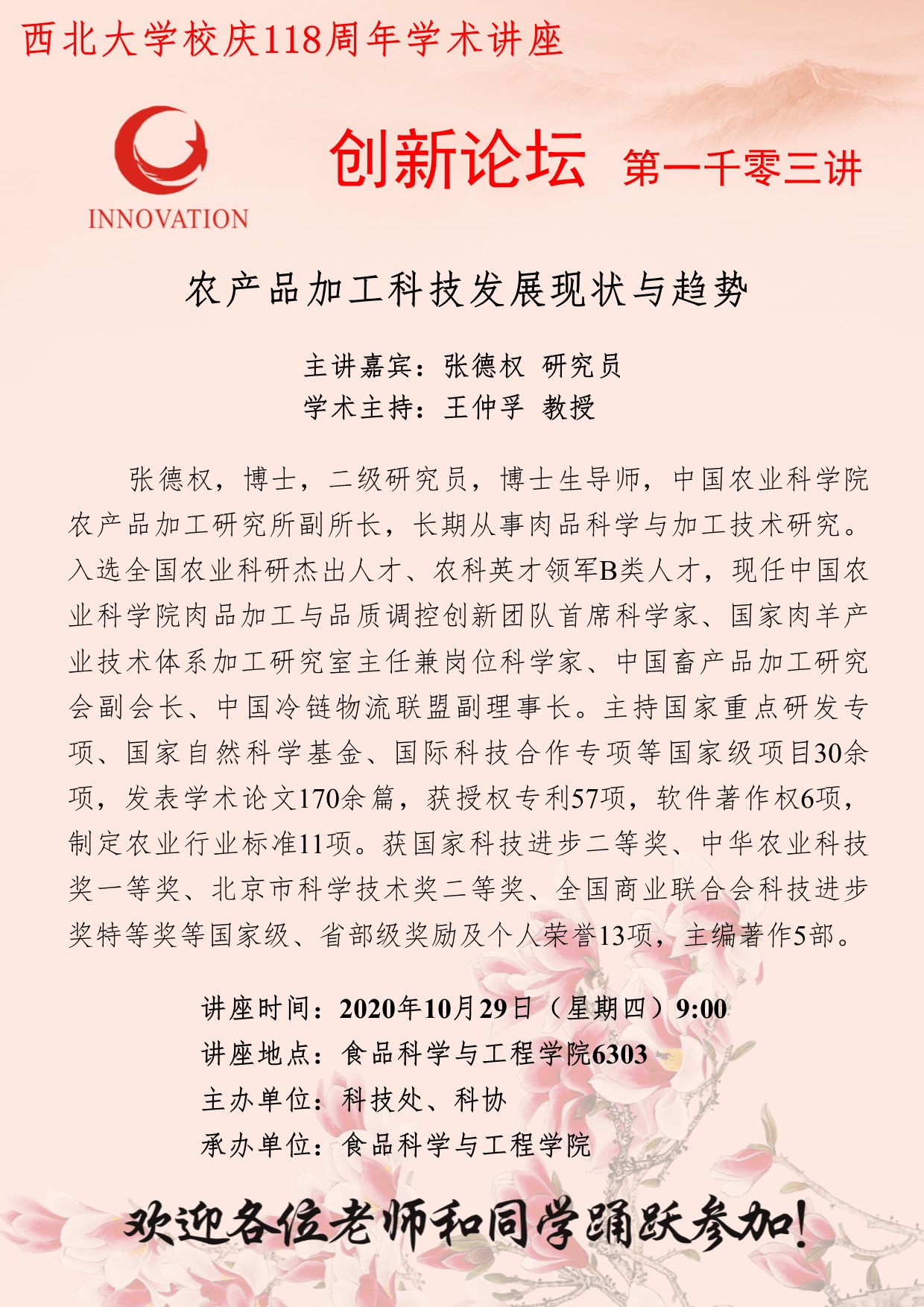 张德权 研究员 米兰网页版·官方端在线创新论坛第一千零三讲暨校庆118周年学术讲座:农产品加工科技发展现状与趋势 讲座时间 2020年10月29日(星期四)9:00 讲座地点 食品科学与工程学院6303 讲座人介绍 张德权 研究员 讲座内容