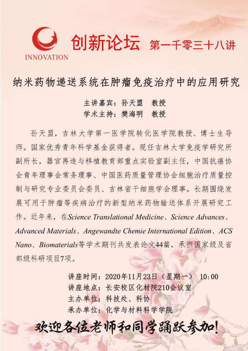 孙天盟 教授 米兰网页版·官方端在线创新论坛第一千零三十八讲:纳米药物递送系统在肿瘤免疫治疗中的应用研究 讲座时间 2020年11月23日(星期一) 10:00 讲座地点 长安校区化材院210会议室 讲座人介绍 孙天盟 教授 讲座内容