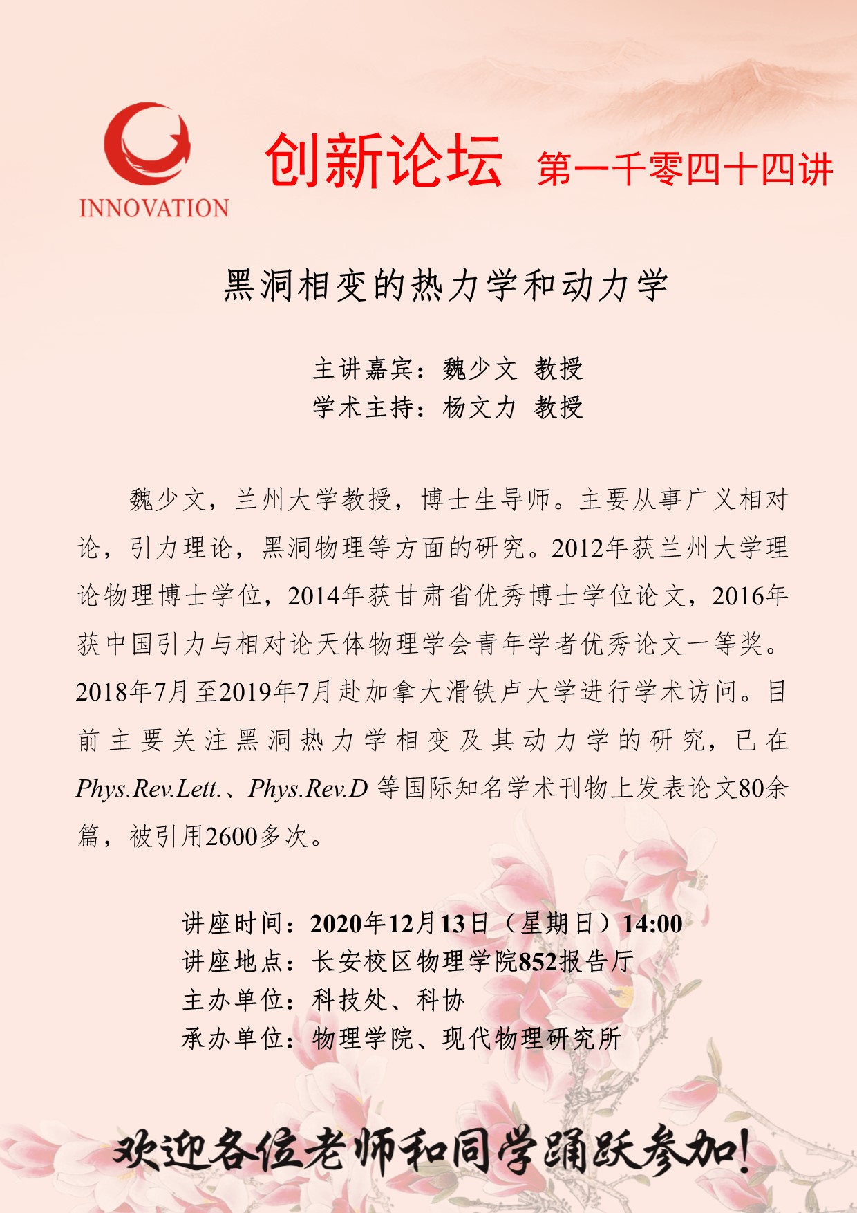 魏少文 教授 米兰网页版·官方端在线创新论坛第一千零四十四讲:黑洞相变的热力学和动力学 讲座时间 2020年12月13日(星期日)14:00 讲座地点 长安校区物理学院852报告厅 讲座人介绍 魏少文 教授 讲座内容
