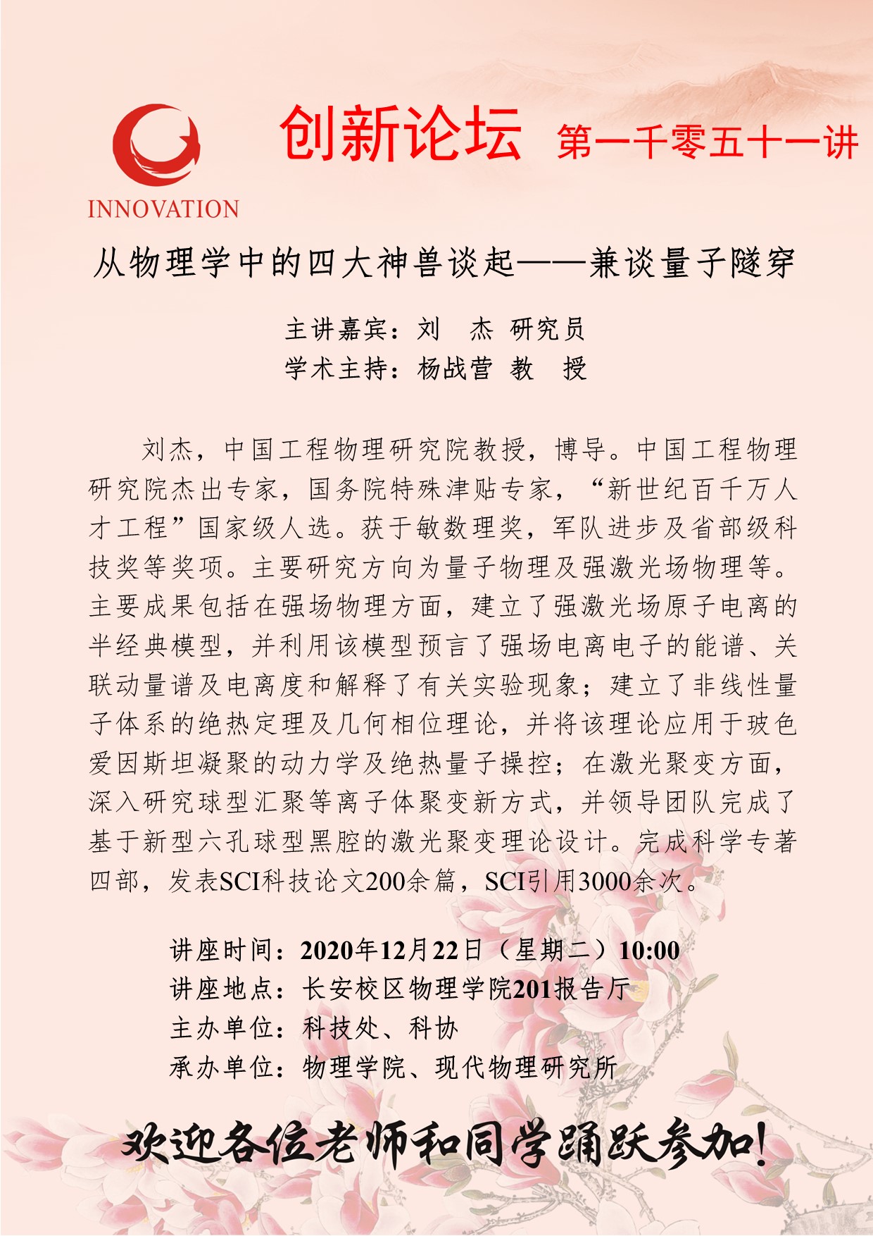 刘 杰 研究员 米兰网页版·官方端在线创新论坛第一千零五十一讲:从物理学中的四大神兽谈起——兼谈量子隧穿 讲座时间 2020年12月22日(星期二)10:00 讲座地点 长安校区物理学院201报告厅 讲座人介绍 刘 杰 研究员 讲座内容
