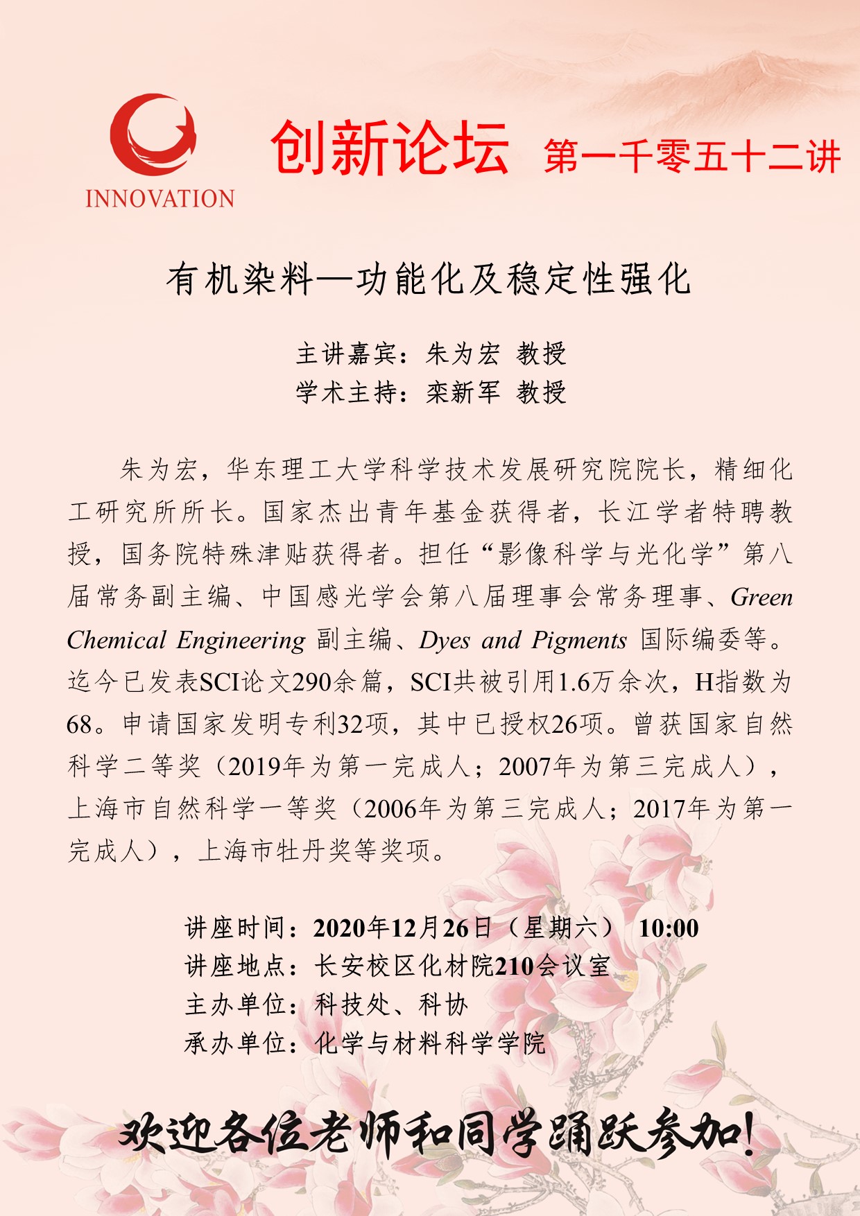 朱为宏 教授 米兰网页版·官方端在线创新论坛第一千零五十二讲: 有机染料—功能化及稳定性强化 讲座时间 2020年12月26日(星期六) 10:00 讲座地点 长安校区化材院210会议室 讲座人介绍 朱为宏 教授 讲座内容