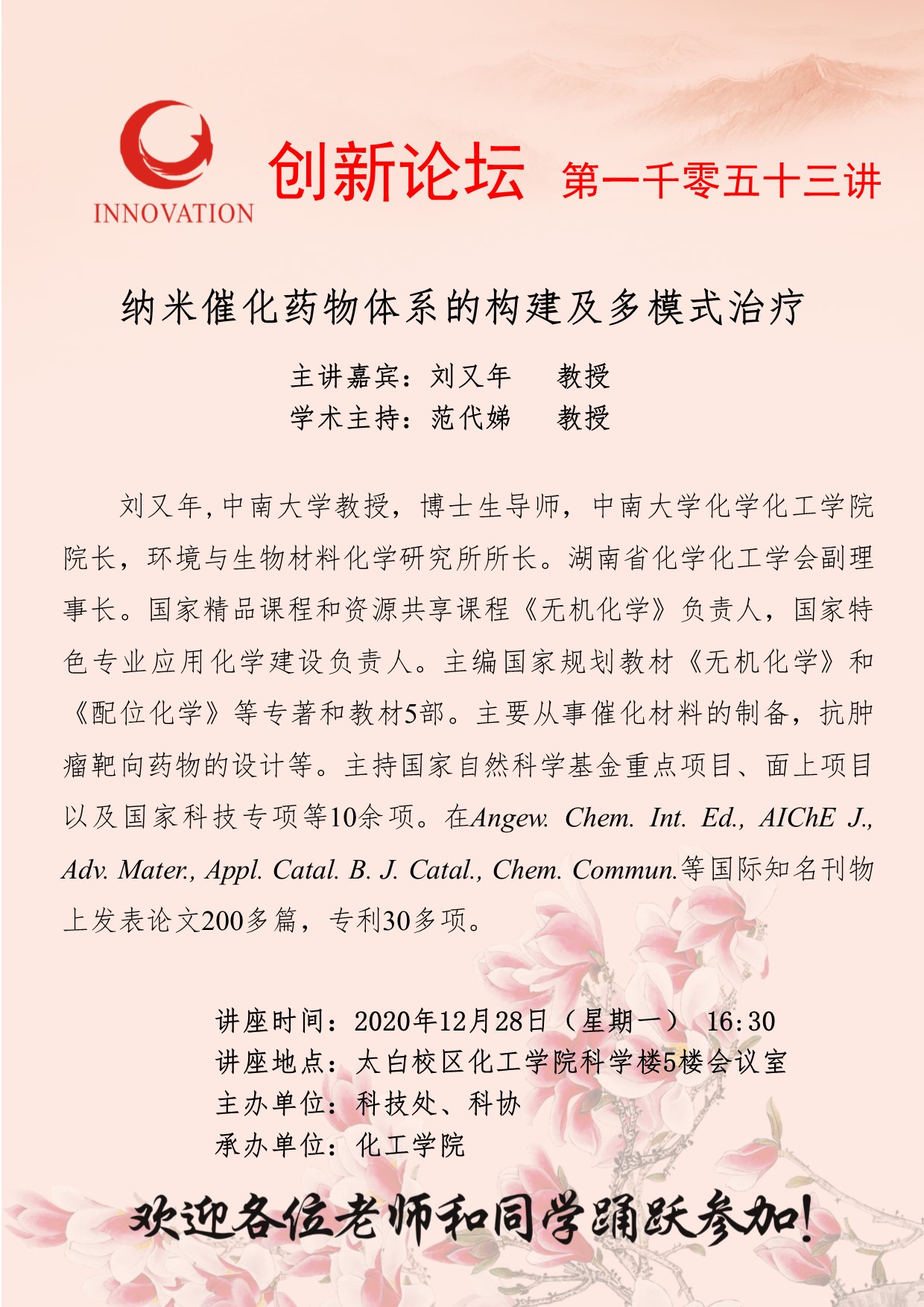 刘又年 教授 米兰网页版·官方端在线创新论坛第一千零五十三讲:纳米催化药物体系的构建及多模式治疗 讲座时间 2020年12月28日(星期一) 16:30 讲座地点 太白校区化工学院科学楼5楼会议室 讲座人介绍 刘又年 教授 讲座内容