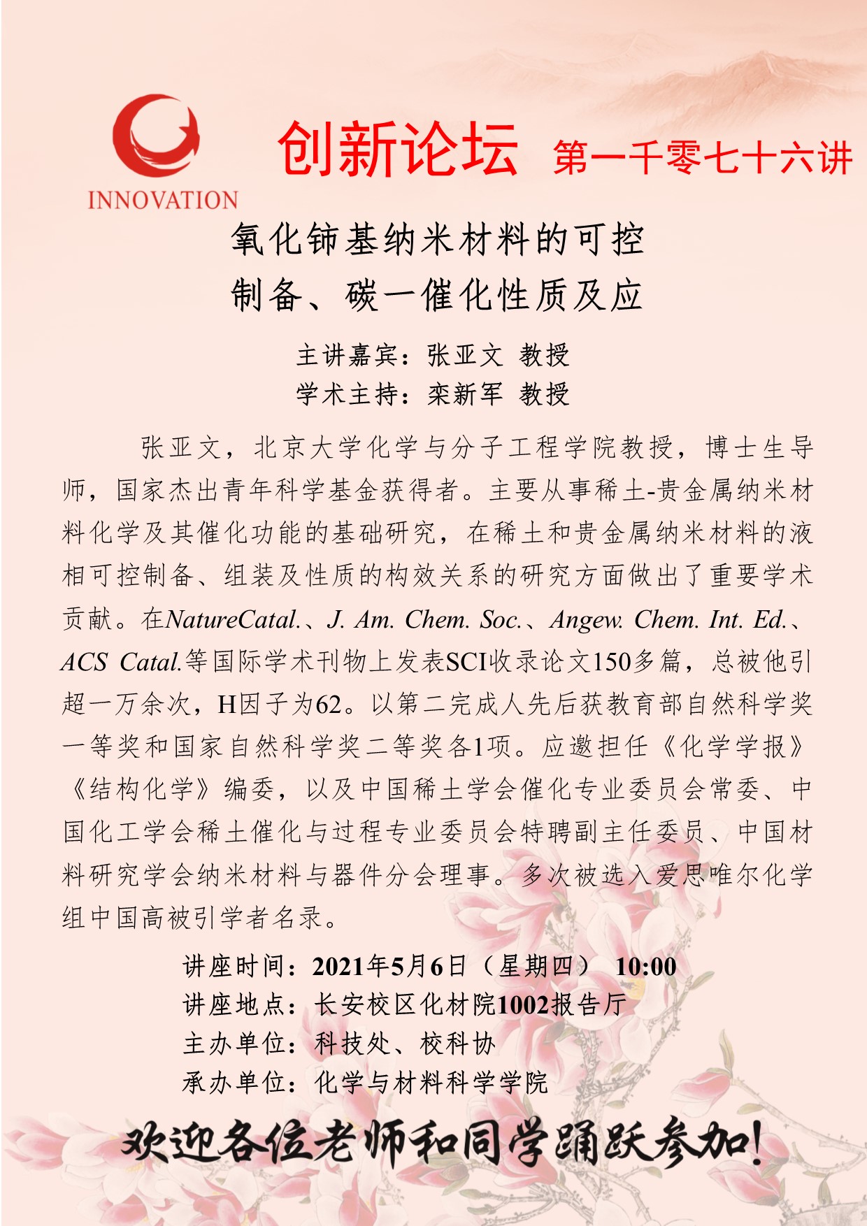 张亚文 教授 米兰网页版·官方端在线创新论坛第一千零七十六讲:氧化铈基纳米材料的可控制备、碳一催化性质及应用 讲座时间 2021年5月6日(星期四) 10:00 讲座地点 长安校区化材院1002报告厅 讲座人介绍 张亚文 教授 讲座内容