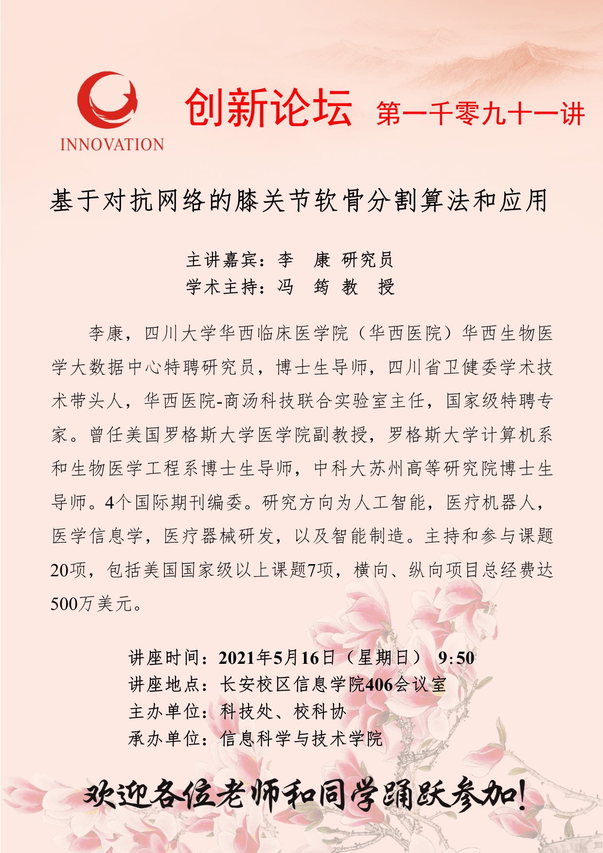 李 康 研究员 米兰网页版·官方端在线创新论坛第一千零九十一讲:基于对抗网络的膝关节软骨分割算法和应用 讲座时间 2021年5月16日(星期日) 9:50 讲座地点 长安校区信息学院406会议室 讲座人介绍 李 康 研究员 讲座内容