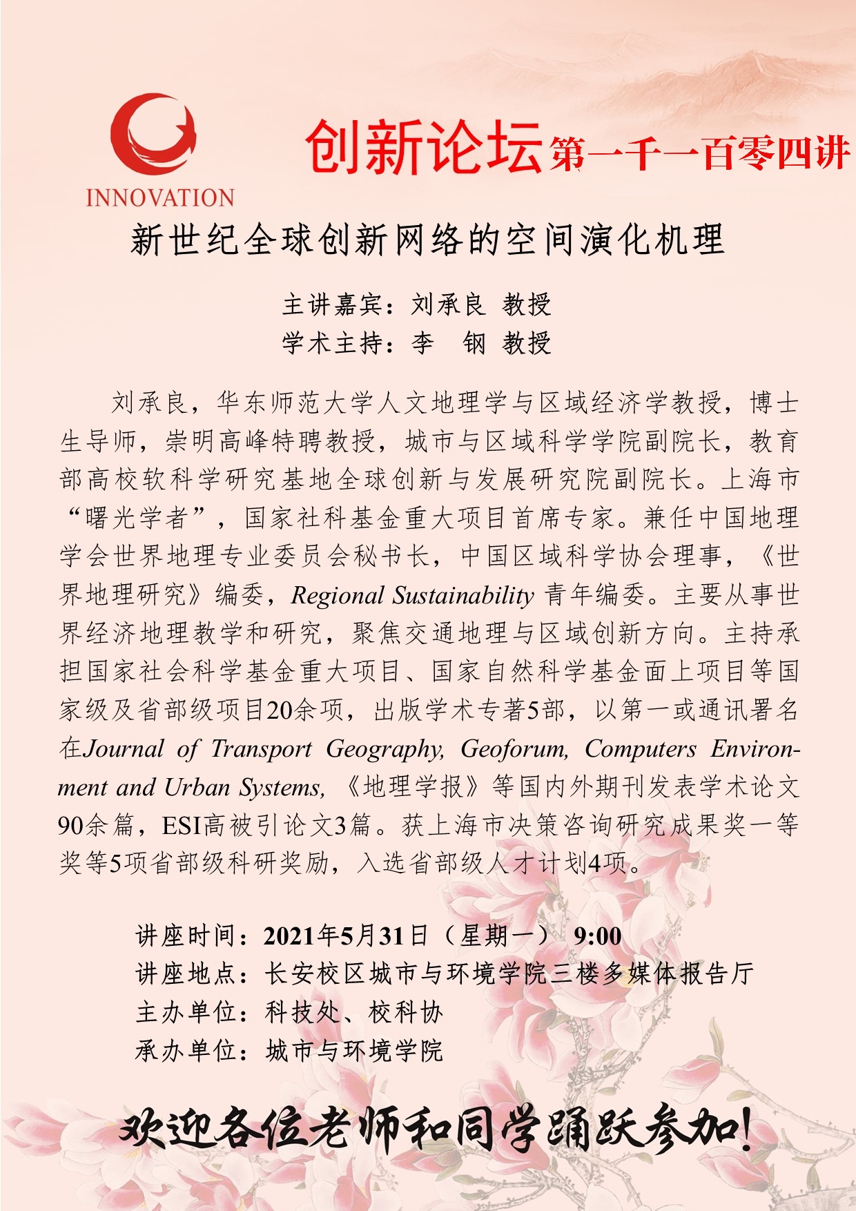 刘承良 教授 米兰网页版·官方端在线创新论坛第一千一百零四讲:新世纪全球创新网络的空间演化机理 讲座时间 2021年5月31日(星期一) 9:00 讲座地点 长安校区城市与环境学院三楼多媒体报告厅 讲座人介绍 刘承良 教授 讲座内容
