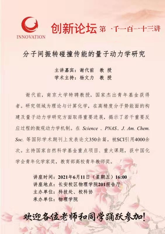 谢代前 教 授 米兰网页版·官方端在线创新论坛第一千一百一十三讲:分子间振转碰撞传能的量子动力学研究 讲座时间 2021年6月11日(星期五)16:00 讲座地点 长安校区物理学院201报告厅 讲座人介绍 谢代前 教 授 讲座内容