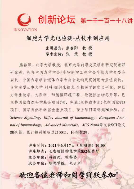 熊春阳 教 授 米兰网页版·官方端在线创新论坛第一千一百一十八讲:细胞力学光电检测-从技术到应用 讲座时间 2021年6月17日(星期四)10:00 讲座地点 长安校区物理学院852报告厅 讲座人介绍 熊春阳 教 授 讲座内容