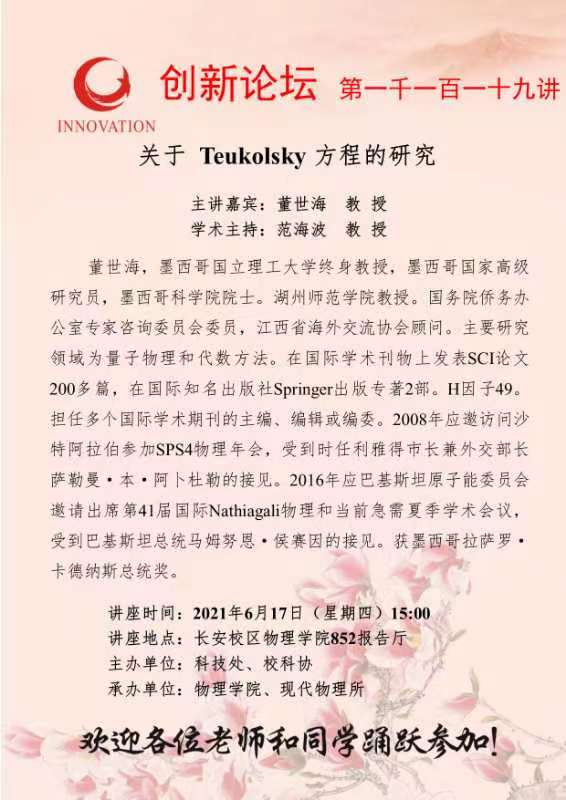 董世海 教 授 米兰网页版·官方端在线创新论坛第一千一百一十九讲:关于 Teukolsky 方程的研究 讲座时间 2021年6月17日(星期四)15:00 讲座地点 长安校区物理学院852报告厅 讲座人介绍 董世海 教 授 讲座内容