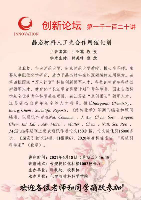 兰亚乾 教 授 米兰网页版·官方端在线创新论坛第一千一百二十讲:晶态材料人工光合作用催化剂 讲座时间 2021年6月18日(星期五)16:45 讲座地点 长安校区化材楼1002报告厅 讲座人介绍 兰亚乾 教 授 讲座内容