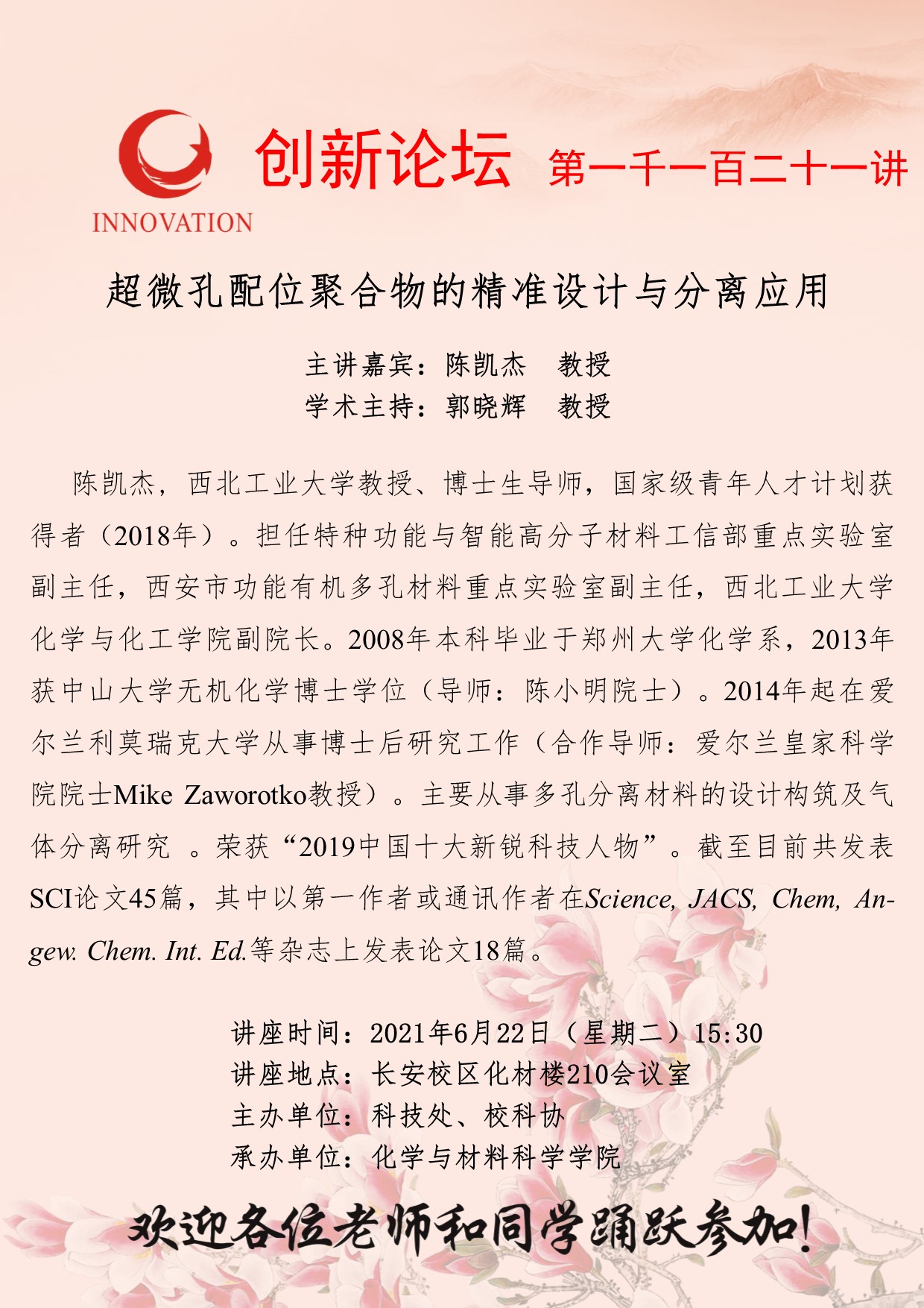 陈凯杰 教授 米兰网页版·官方端在线创新论坛第一千一百二十一讲:超微孔配位聚合物的精准设计与分离应用 讲座时间 2021年6月22日(星期二)15:30 讲座地点 长安校区化材楼210会议室 讲座人介绍 陈凯杰 教授 讲座内容