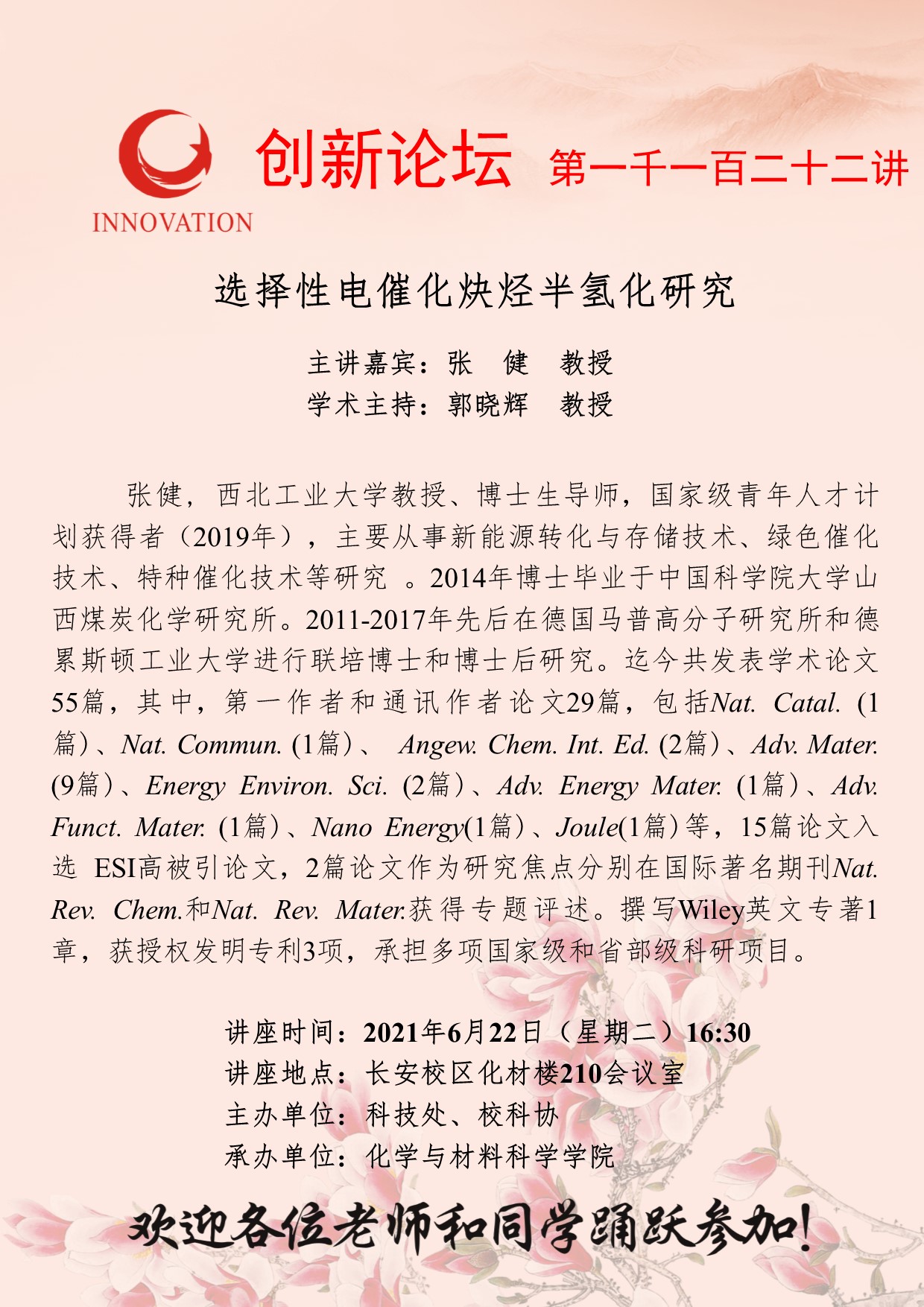 张 健 教授 米兰网页版·官方端在线创新论坛第一千一百二十二讲:选择性电催化炔烃半氢化研究 讲座时间 2021年6月22日(星期二)16:30 讲座地点 长安校区化材楼210会议室 讲座人介绍 张 健 教授 讲座内容