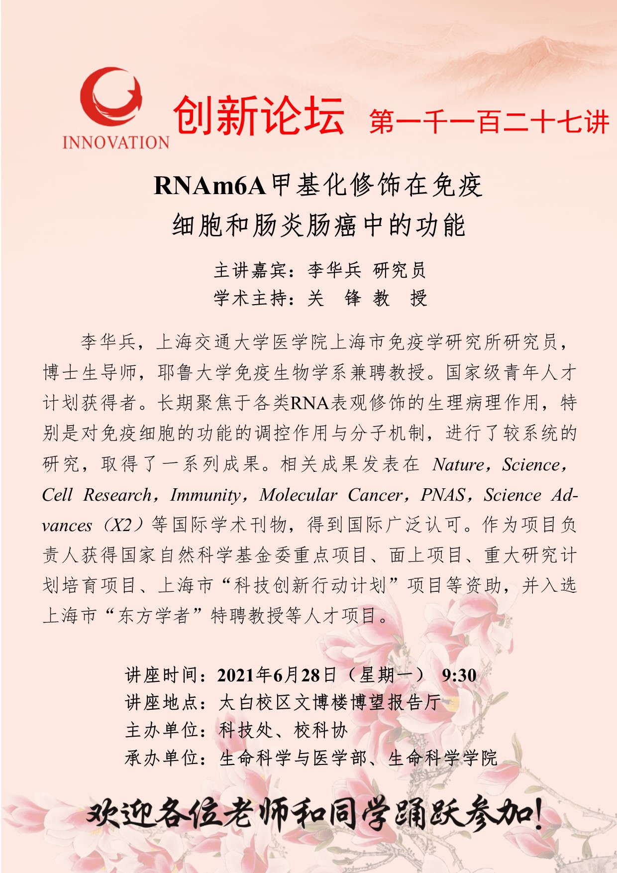 李华兵 研究员 米兰网页版·官方端在线创新论坛第一千一百二十七讲:RNAm6A甲基化修饰在免疫细胞和肠炎肠癌中的功能 讲座时间 2021年6月28日(星期一) 9:30 讲座地点 太白校区文博楼博望报告厅 讲座人介绍 李华兵 研究员 讲座内容