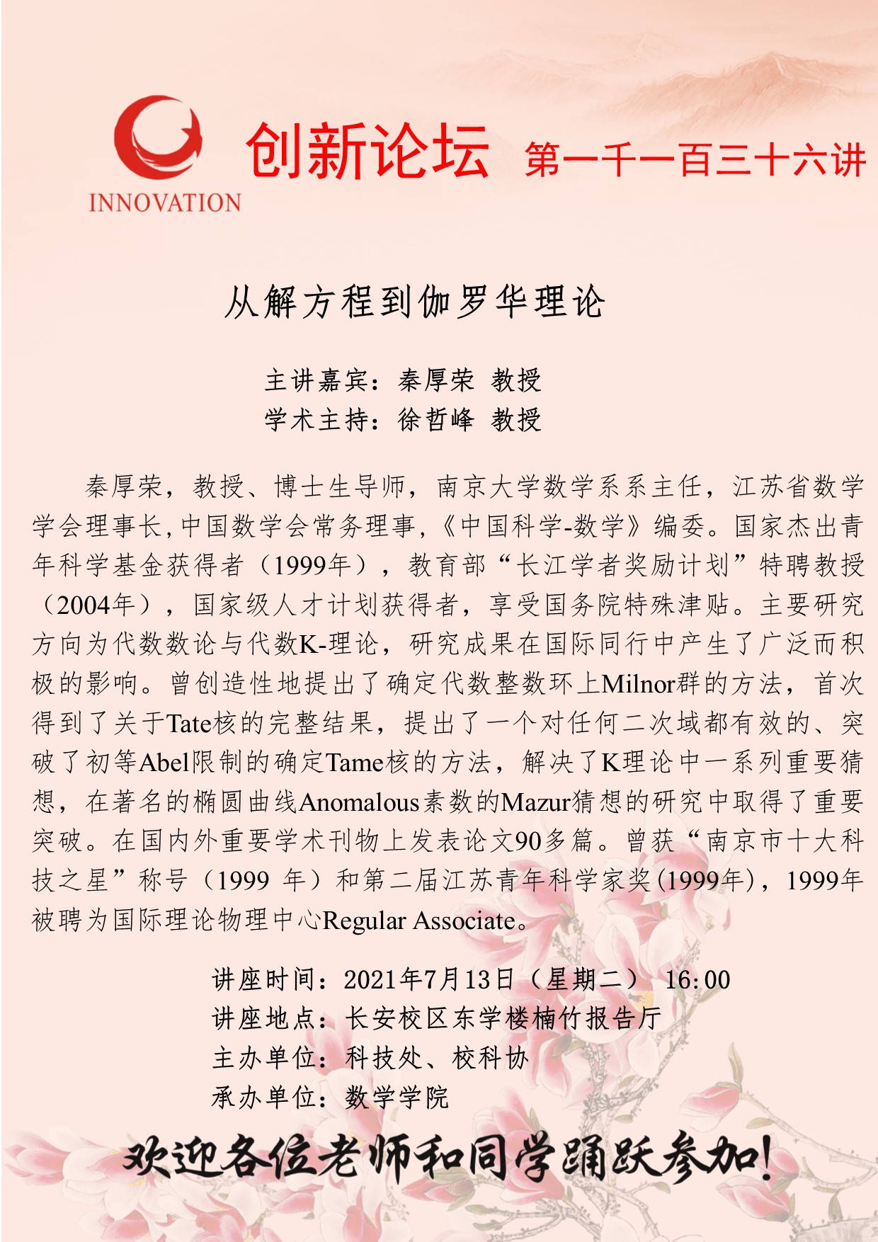 秦厚荣 教授 米兰网页版·官方端在线创新论坛第一千一百三十六讲:从解方程到伽罗华理论 讲座时间 2021年7月13日 (星期二)16:00 讲座地点 长安校区东学楼楠竹报告厅 讲座人介绍 秦厚荣 教授 讲座内容