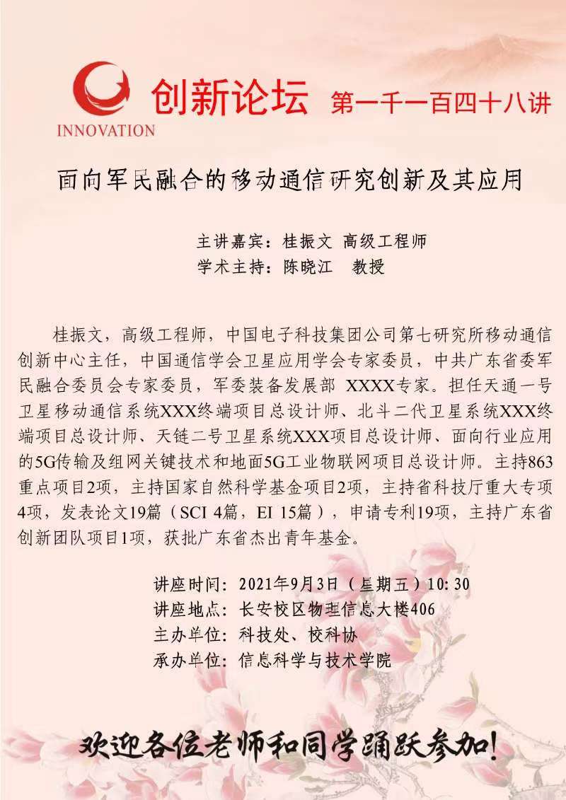 桂振文 高级工程师 米兰网页版·官方端在线创新论坛第一千一百四十八讲:面向军民融合的移动通信研究创新及其应用 讲座时间 2021年9月3日(星期五)10:30 讲座地点 长安校区物理信息大楼406 讲座人介绍 桂振文 高级工程师 讲座内容