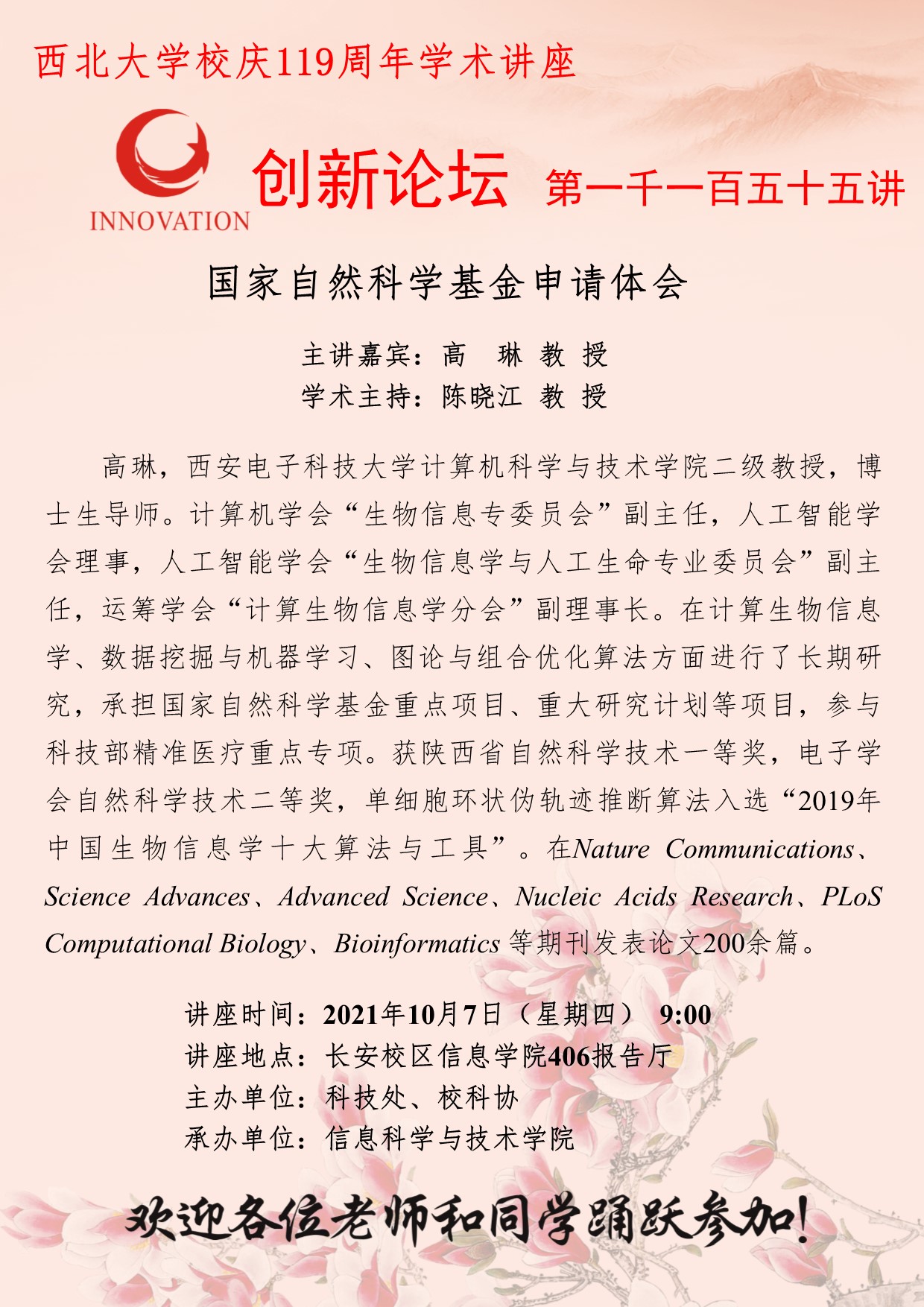 高琳 教授 米兰网页版·官方端在线创新论坛第一千一百五十五讲暨校庆119周年学术讲座: 国家自然科学基金申请体会 讲座时间 2021年10月7日(星期四) 9:00 讲座地点 长安校区信息学院406报告厅 讲座人介绍 高琳 教授 讲座内容