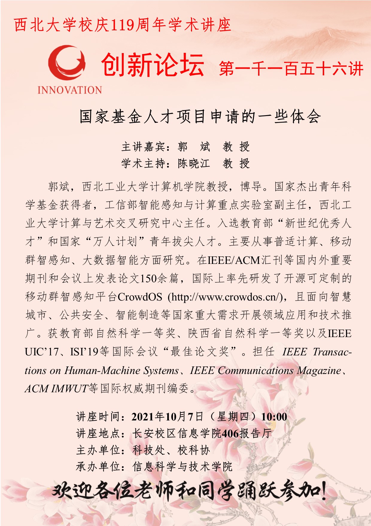 郭斌 教授 米兰网页版·官方端在线创新论坛第一千一百五十六讲暨校庆119周年学术讲座: 国家基金人才项目申请的一些体会 讲座时间 2021年10月7日(星期四)10:00 讲座地点 长安校区信息学院406报告厅 讲座人介绍 郭斌 教授 讲座内容
