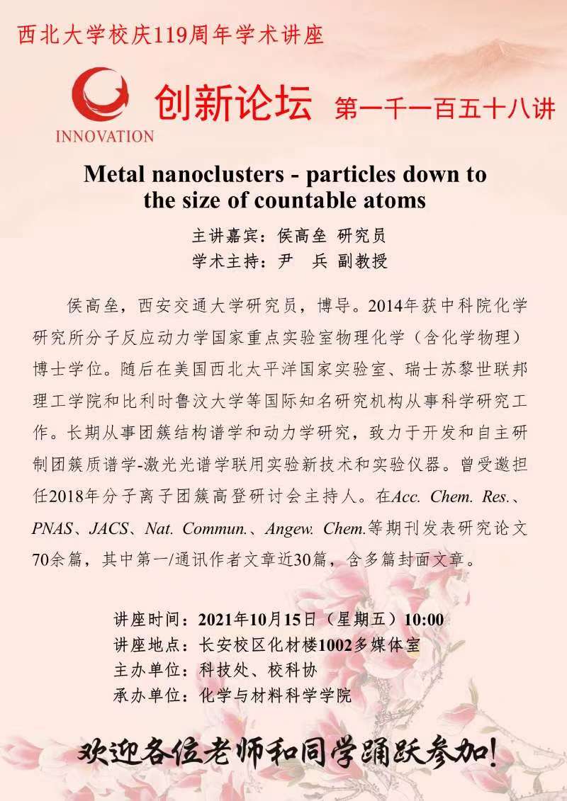 侯高垒 研究员 米兰网页版·官方端在线创新论坛第一千一百五十八讲暨校庆119周年学术讲座: Metal nanoclusters - particles down to the size of countable atoms 讲座时间 2021年10月15日(星期五)10:00 讲座地点 长安校区化材楼1002多媒体室 讲座人介绍 侯高垒 研究员 讲座内容