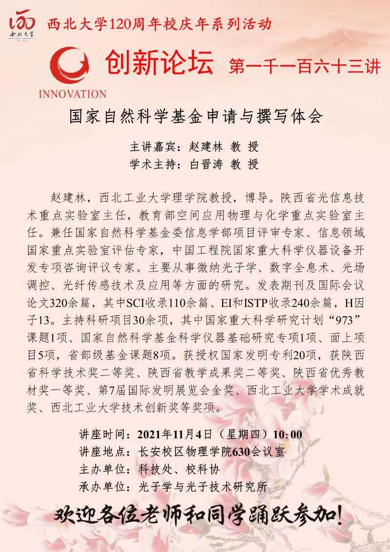 赵建林 教授 米兰网页版·官方端在线创新论坛第一千一百六十三讲暨120周年校庆年系列活动:国家自然科学基金申请与撰写体会 讲座时间 2021年11月4日(星期四)10:00 讲座地点 长安校区物理学院630会议室 讲座人介绍 赵建林 教授 讲座内容