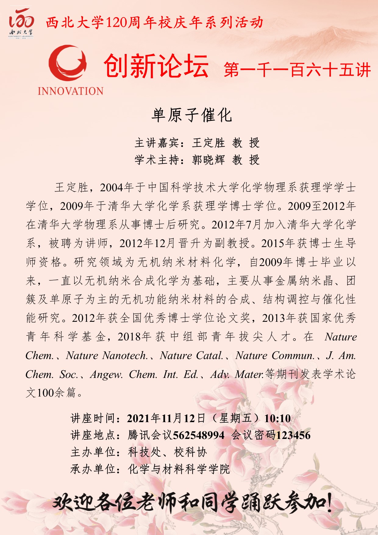 王定胜 教授 米兰网页版·官方端在线创新论坛第一千一百六十五讲暨120周年校庆年系列活动:单原子催化 讲座时间 2021年11月12日(星期五)10:10 讲座地点 腾讯会议562548994 会议密码123456 讲座人介绍 王定胜 教授 讲座内容