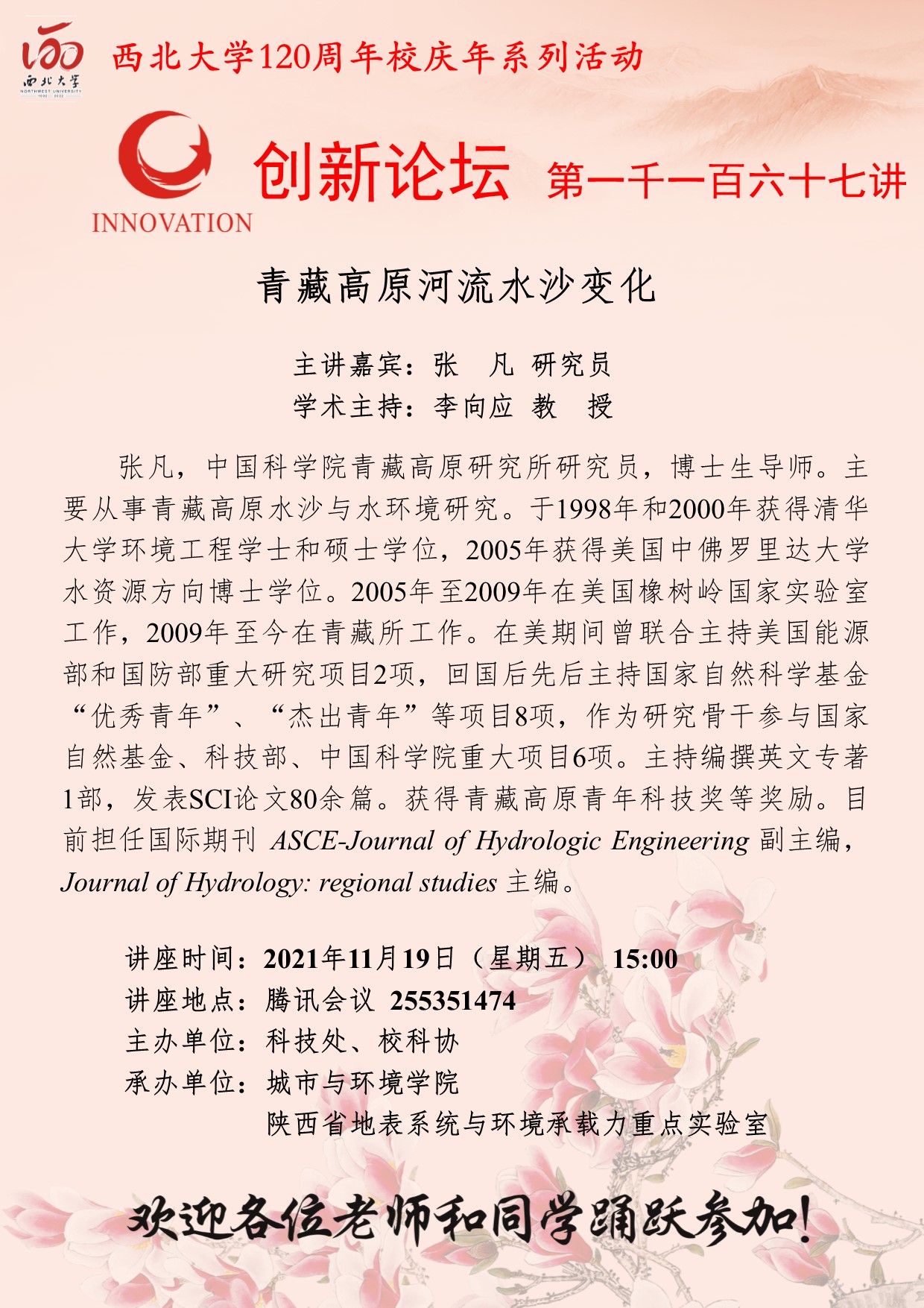 张凡 研究员 米兰网页版·官方端在线创新论坛第一千一百六十七讲暨120周年校庆年系列活动:青藏高原河流水沙变化 讲座时间 2021年11月19日(星期五) 15:00 讲座地点 腾讯会议 255351474 讲座人介绍 张凡 研究员 讲座内容