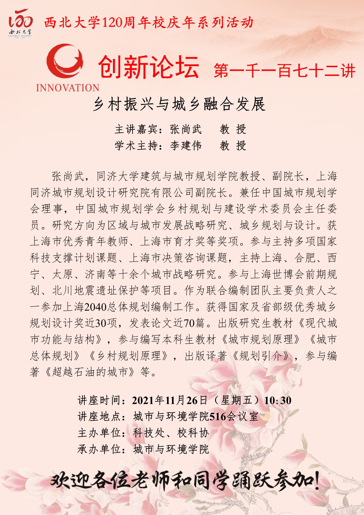 张尚武 教授 米兰网页版·官方端在线创新论坛第一千一百七十二讲暨120周年校庆年系列活动:乡村振兴与城乡融合发展 讲座时间 2021年11月26日(星期五)10:30 讲座地点 城市与环境学院516会议室 讲座人介绍 张尚武 教授 讲座内容