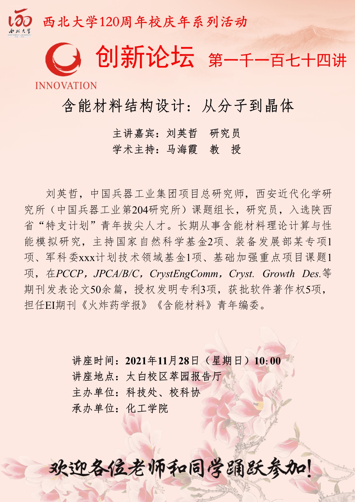 刘英哲 研究员 米兰网页版·官方端在线创新论坛第一千一百七十四讲暨120周年校庆年系列活动:含能材料结构设计: 从分子到晶体 讲座时间 2021年11月28日(星期日)10:00 讲座地点 太白校区萃园报告厅 讲座人介绍 刘英哲 研究员 讲座内容