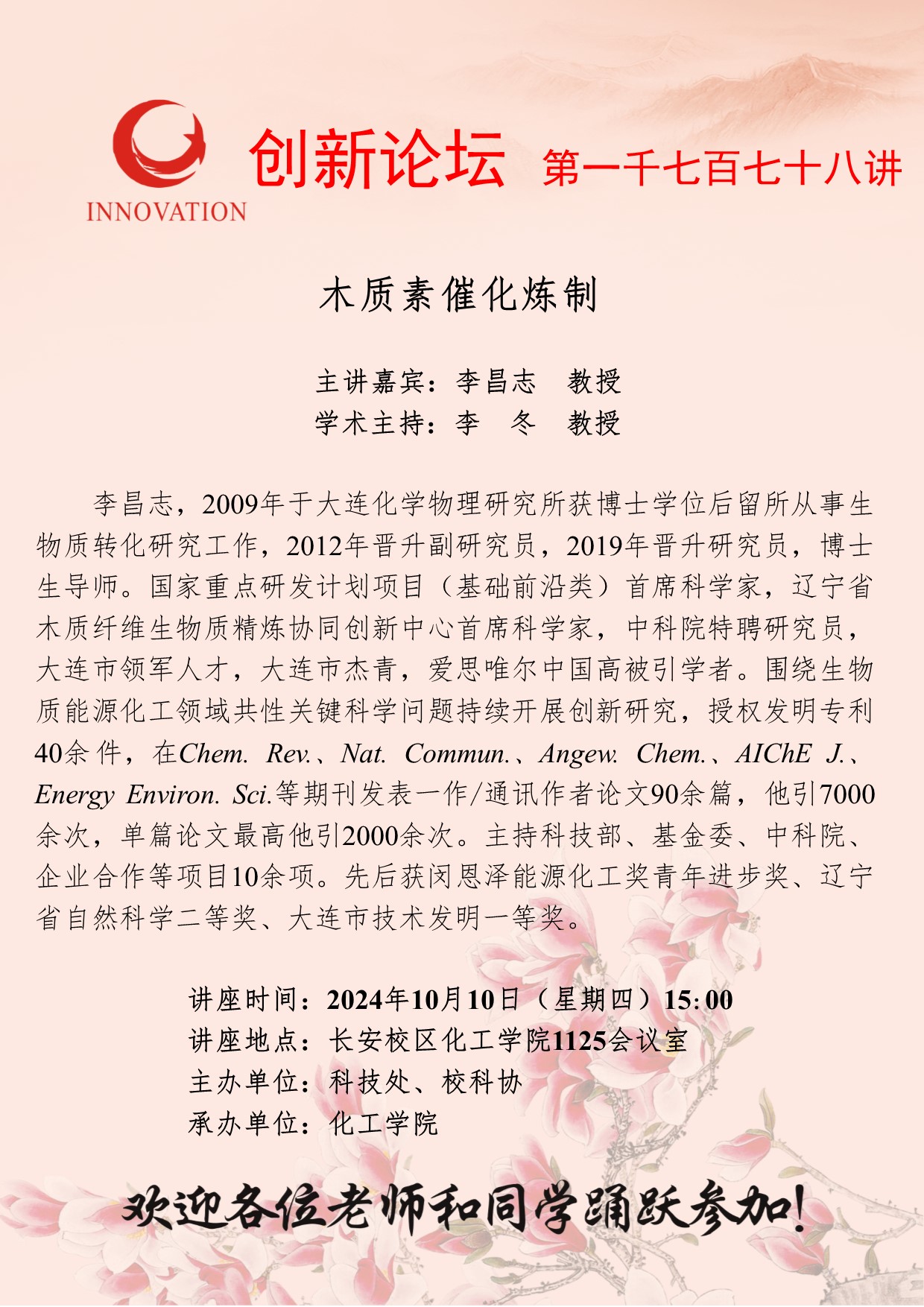 李昌志 教授 米兰网页版·官方端在线创新论坛第一千七百七十八讲:木质素催化炼制 讲座时间 2024年10月10日(星期四)15:00 讲座地点 长安校区化工学院1125会议室 讲座人介绍 李昌志 教授 讲座内容