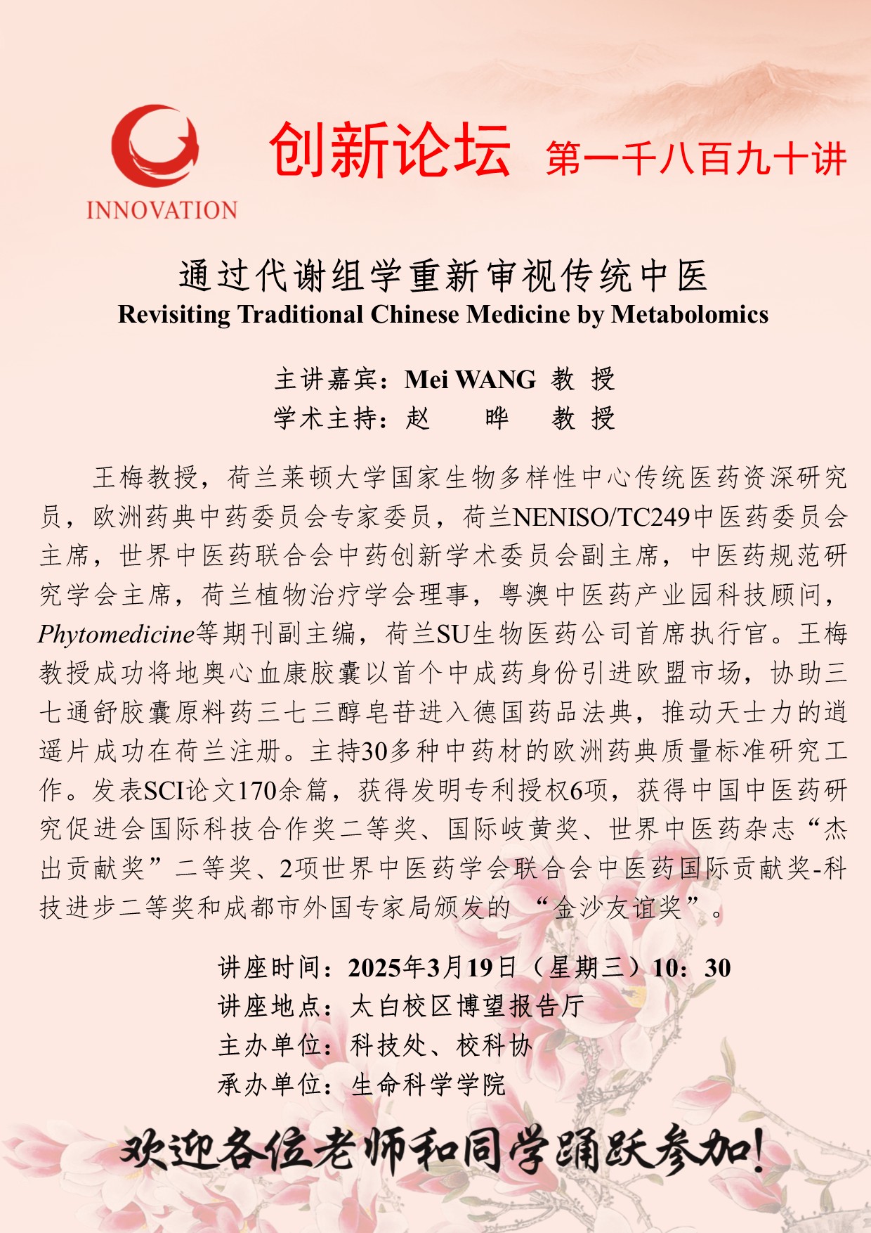 Mei WANG 教授 米兰网页版·官方端在线创新论坛第一千八百九十讲:通过代谢组学重新审视传统中医Revisiting Traditional Chinese Medicine by Metabolomics 讲座时间 2025年3月19日(星期三)10:30 讲座地点 太白校区博望报告厅 讲座人介绍 Mei WANG 教授 讲座内容