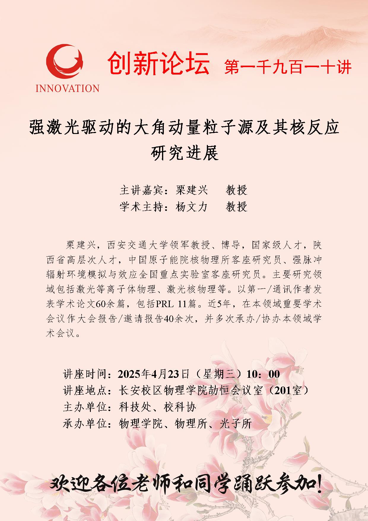 栗建兴 教授 米兰网页版·官方端在线创新论坛第一千九百一十讲:强激光驱动的大角动量粒子源及其核反应研究进展 讲座时间 2025年4月23日(星期三)10:00 讲座地点 长安校区物理学院劼恒会议室(201室) 讲座人介绍 栗建兴 教授 讲座内容