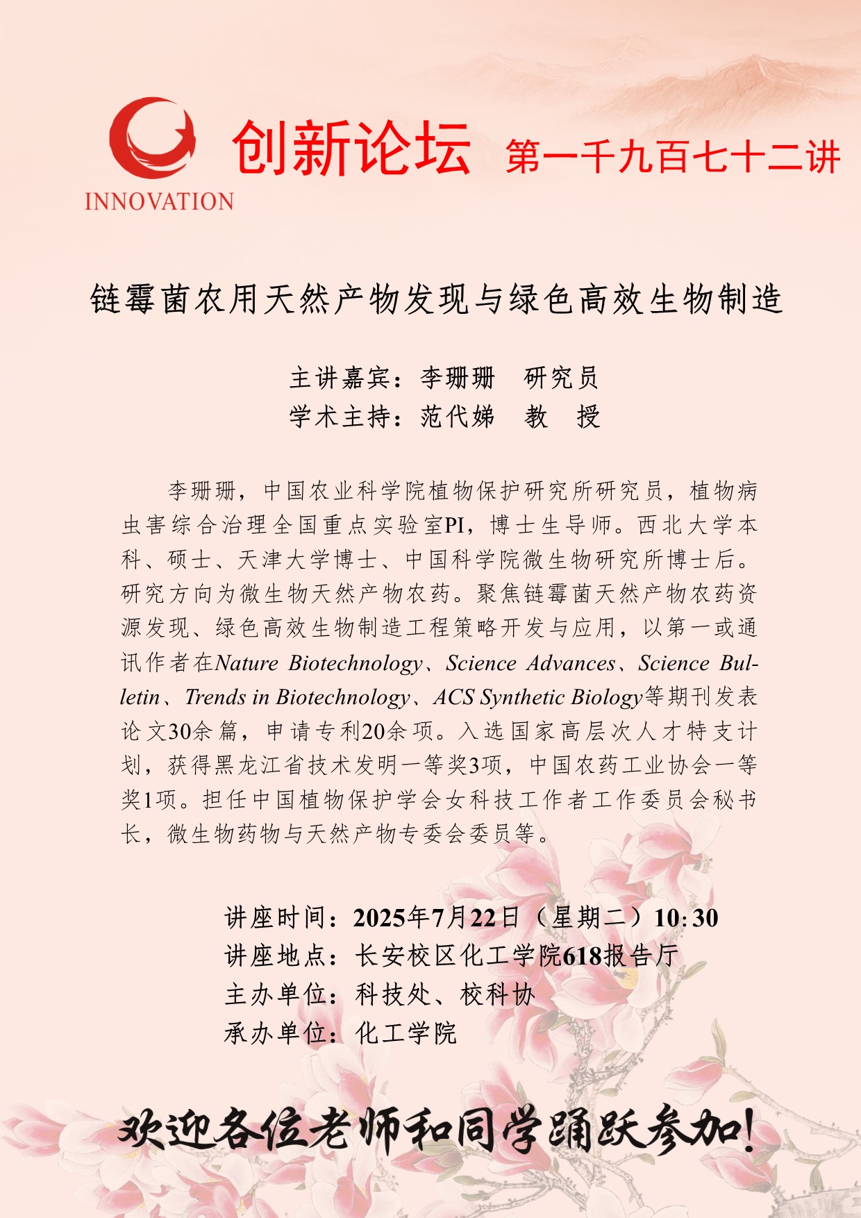 李珊珊 研究员 米兰网页版·官方端在线创新论坛第一千九百七十二讲:链霉菌农用天然产物发现与绿色高效生物制造 讲座时间 2025年7月22日(星期二)10:30 讲座地点 长安校区化工学院618报告厅 讲座人介绍 李珊珊 研究员 讲座内容