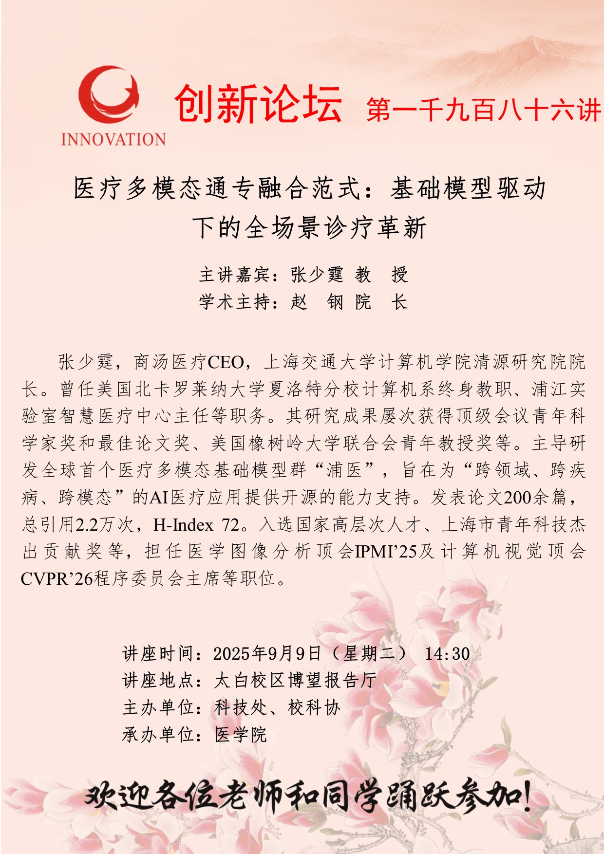 张少霆 教 授 米兰网页版·官方端在线创新论坛第一千九百八十六讲:医疗多模态通专融合范式:基础模型驱动下的全场景诊疗革新 讲座时间 2025年9月9日(星期二) 14:30 讲座地点 太白校区博望报告厅 讲座人介绍 张少霆 教 授 讲座内容 fu