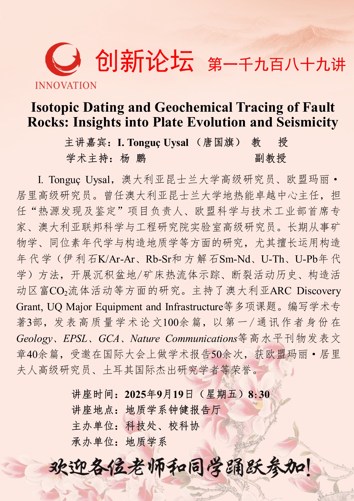 I. Tonguç Uysal 教授 米兰网页版·官方端在线创新论坛第一千九百八十九讲:Isotopic Dating and Geochemical Tracing of Fault Rocks: Insights into Plate Evolution and Seismicity 讲座时间 2025年9月19日(星期五)8:30 讲座地点 地质学系钟健报告厅 讲座人介绍 I. Tonguç Uysal 教授 讲座内容