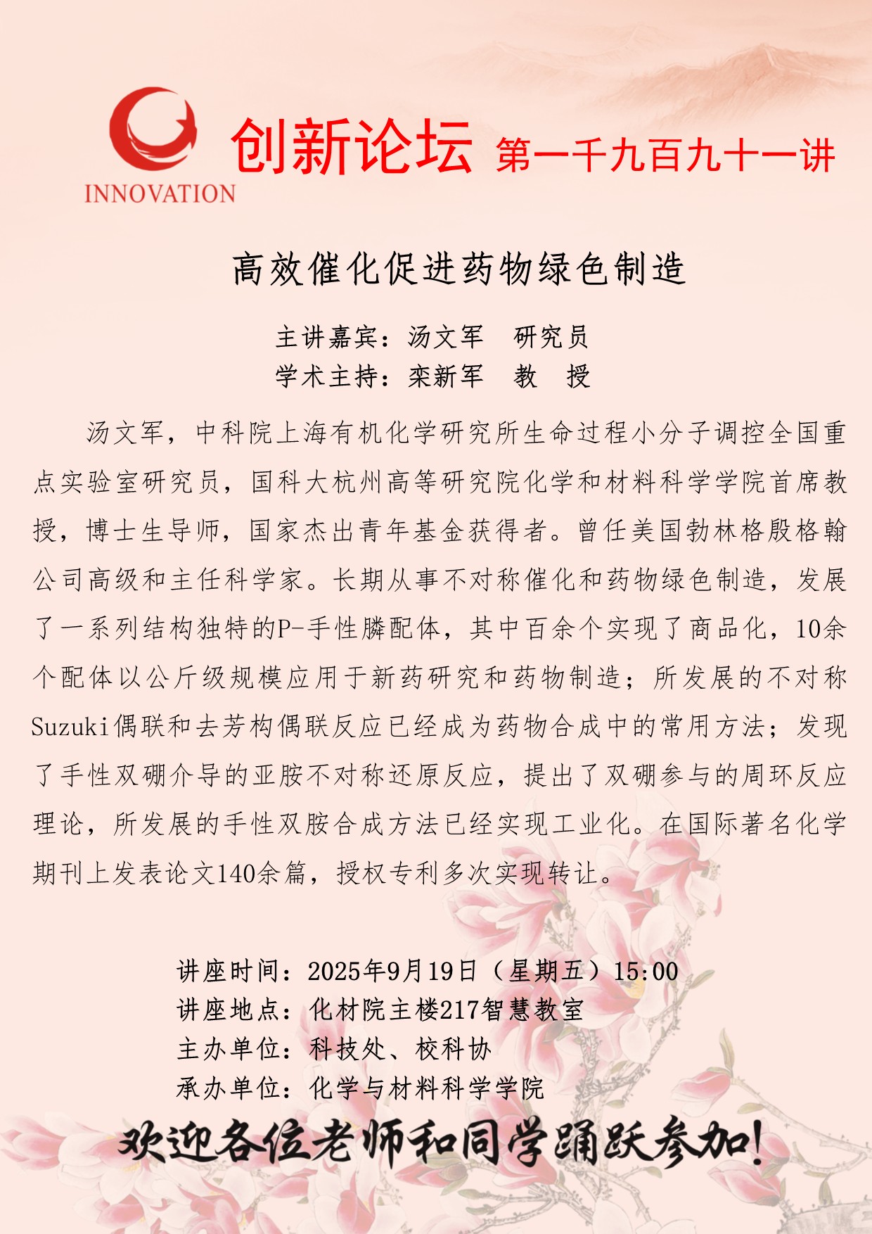 汤文军 研究员 米兰网页版·官方端在线创新论坛第一千九百九十一讲:高效催化促进药物绿色制造 讲座时间 2025年9月19日(星期五)15:00 讲座地点 化材院主楼217智慧教室 讲座人介绍 汤文军 研究员 讲座内容