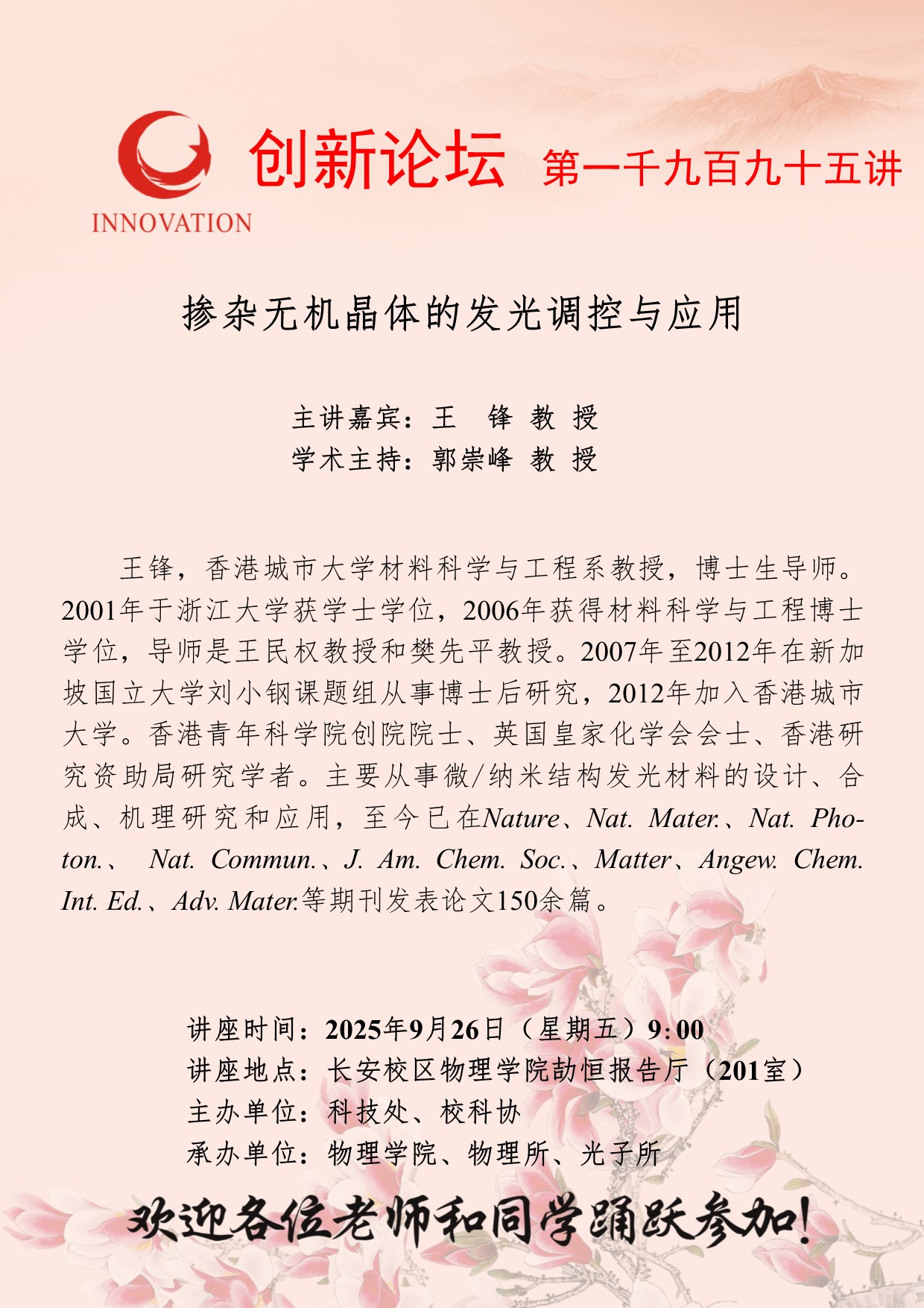 王锋 教授 米兰网页版·官方端在线创新论坛第一千九百九十五讲:掺杂无机晶体的发光调控与应用 讲座时间 2025年9月26日(星期五)9:00 讲座地点 长安校区物理学院劼恒报告厅(201室) 讲座人介绍 王锋 教授 讲座内容