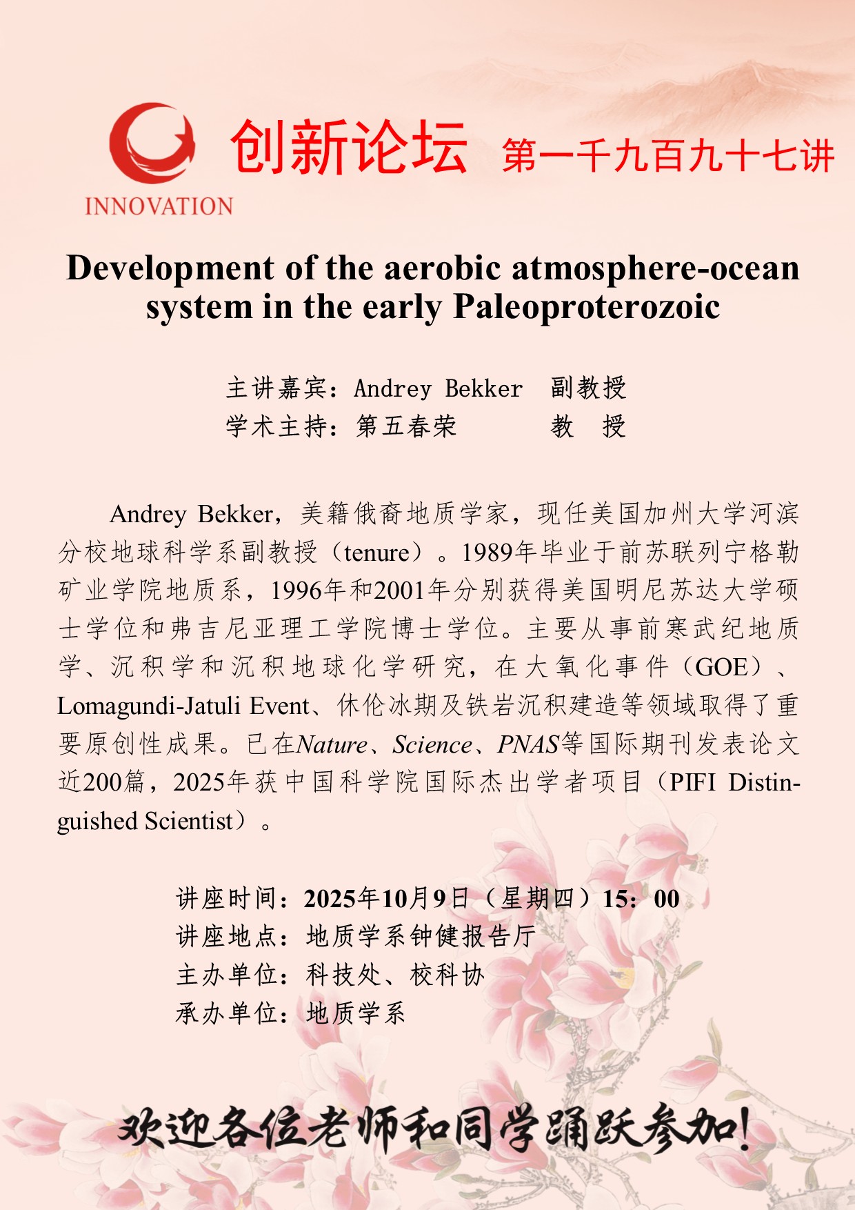 Andrey Bekker 副教授 米兰网页版·官方端在线创新论坛第一千九百九十七讲:Development of the aerobic atmosphere-ocean system in the early Paleoproterozoic 讲座时间 2025年10月9日(星期四)15:00 讲座地点 地质学系钟健报告厅 讲座人介绍 Andrey Bekker 副教授 讲座内容