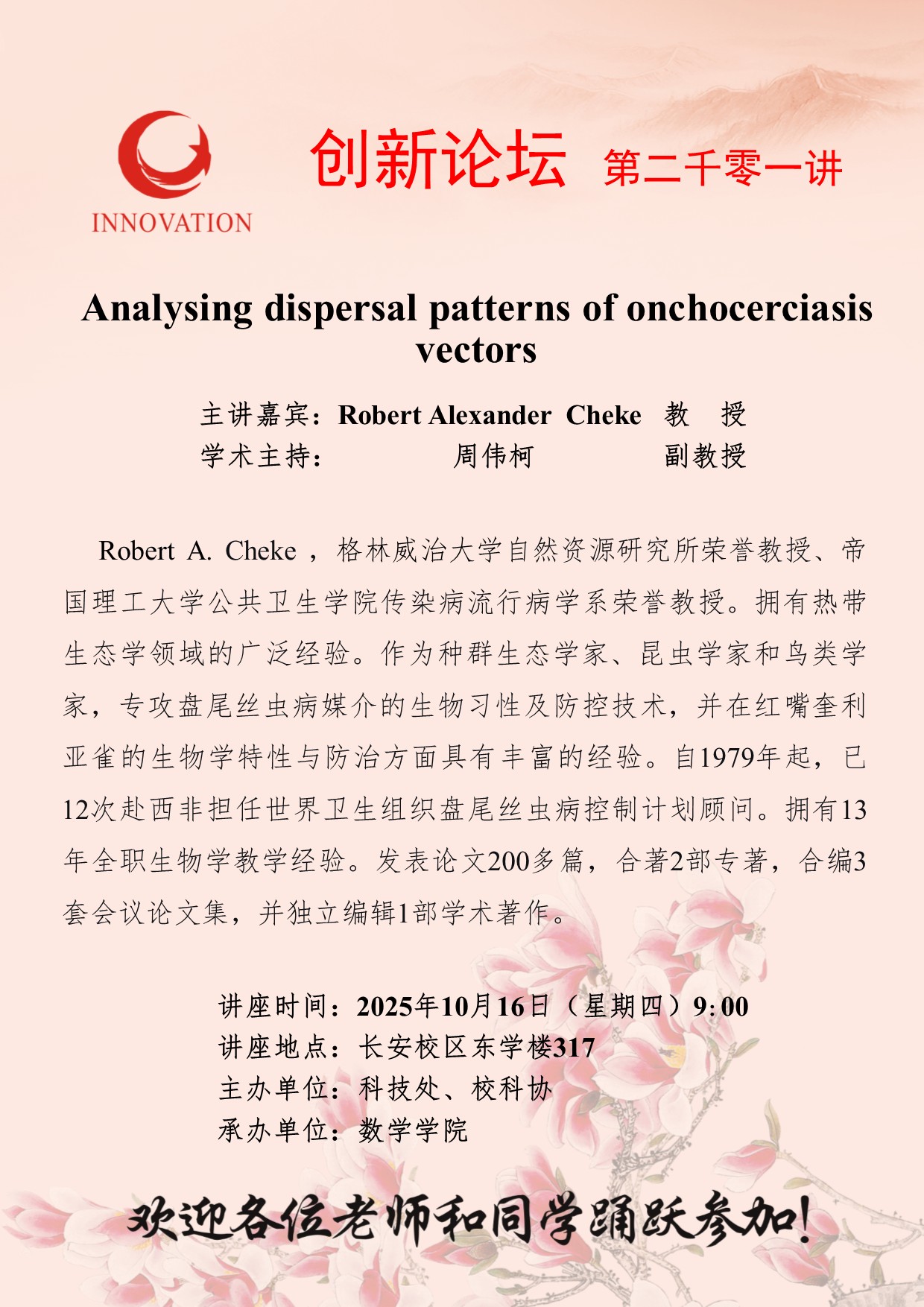 Robert Alexander Cheke 教授 米兰网页版·官方端在线创新论坛第二千零一讲:Analysing dispersal patterns of onchocerciasis vectors 讲座时间 2025年10月16日(星期四)9:00 讲座地点 长安校区东学楼317 讲座人介绍 Robert Alexander Cheke 教授 讲座内容
