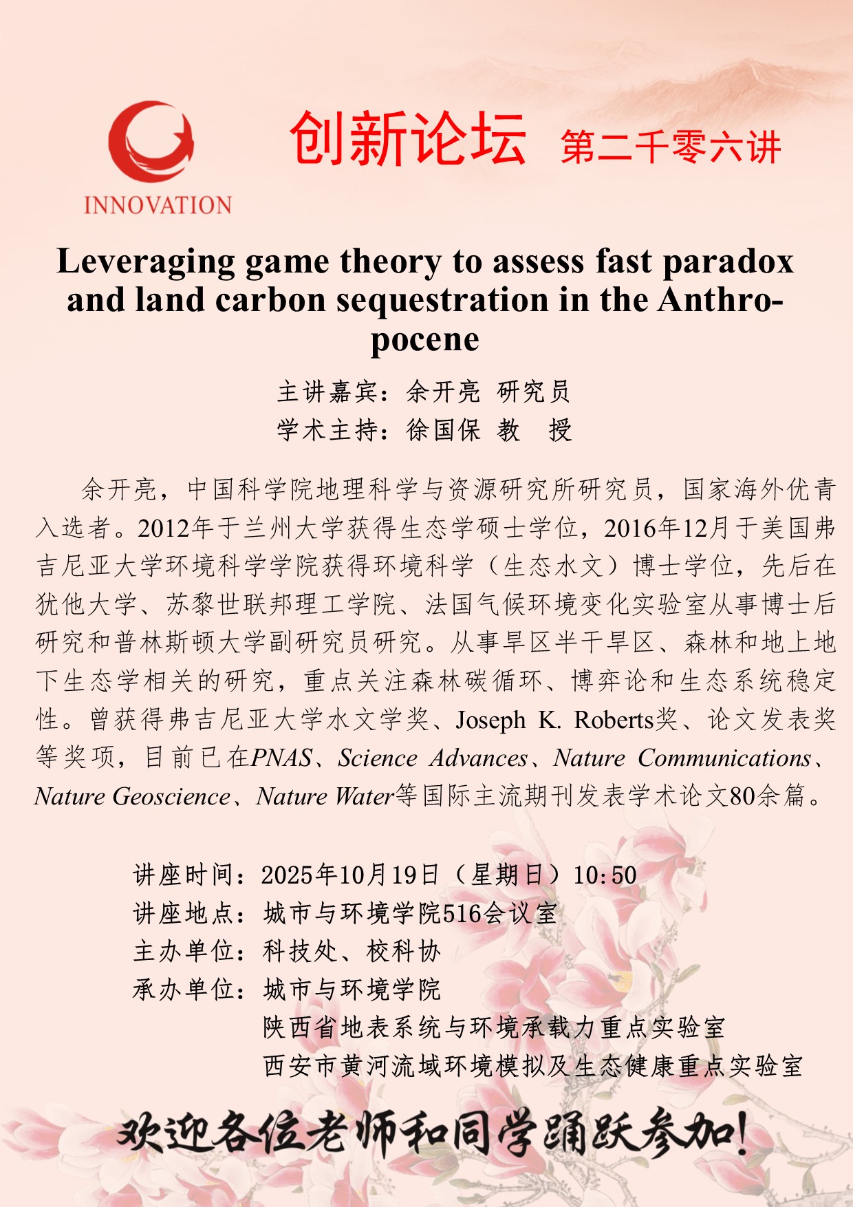 余开亮 研究员 米兰网页版·官方端在线创新论坛第二千零六讲:Leveraging game theory to assess fast paradoxand land carbon sequestration in the Anthro-pocene 讲座时间 2025年10月19日(星期日)10:50 讲座地点 城市与环境学院516会议室 讲座人介绍 余开亮 研究员 讲座内容