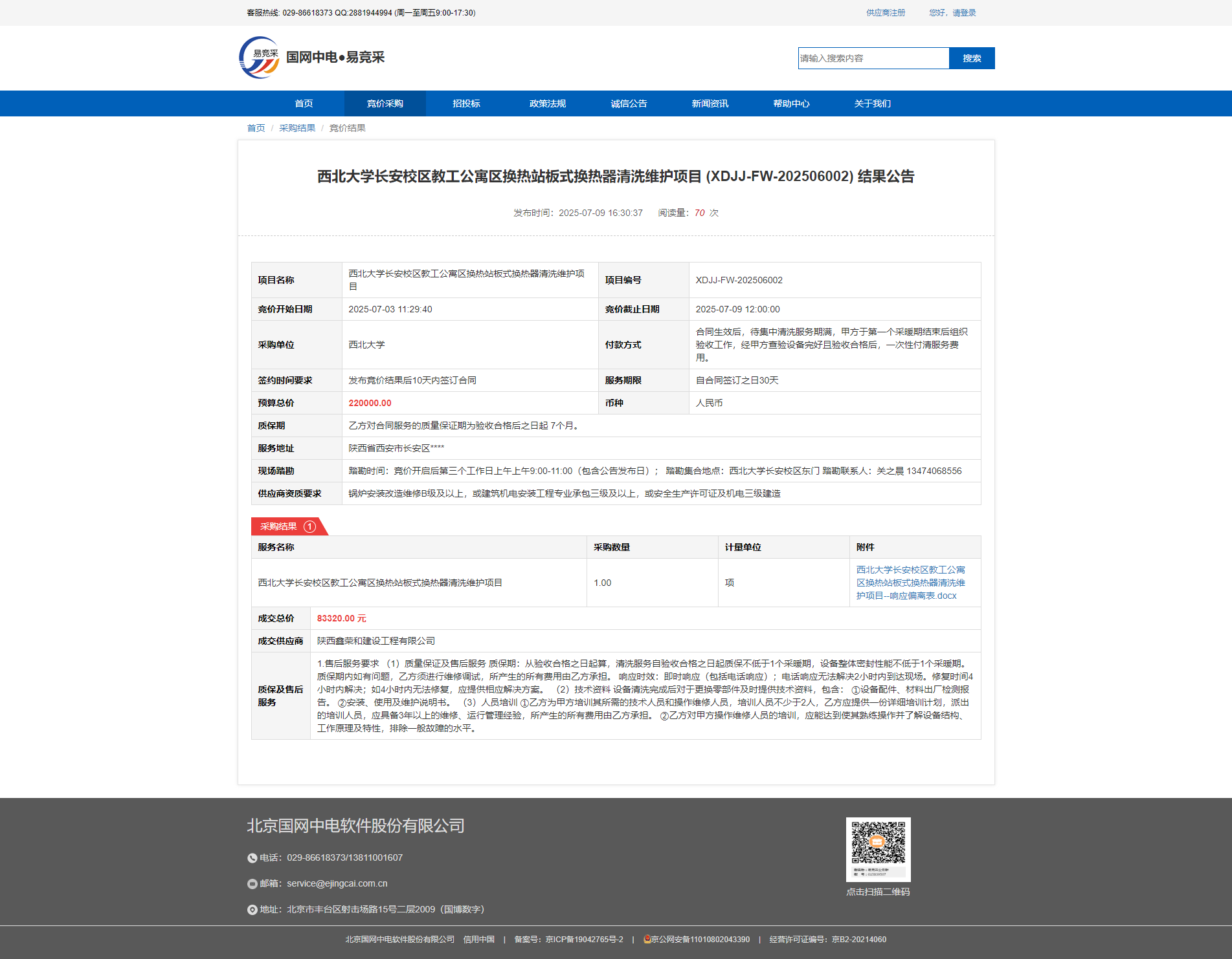 米兰网页版·官方端在线长安校区教工公寓区换热站板式换热器清洗维护项目 (XDJJ-FW-202506002) 结果公告