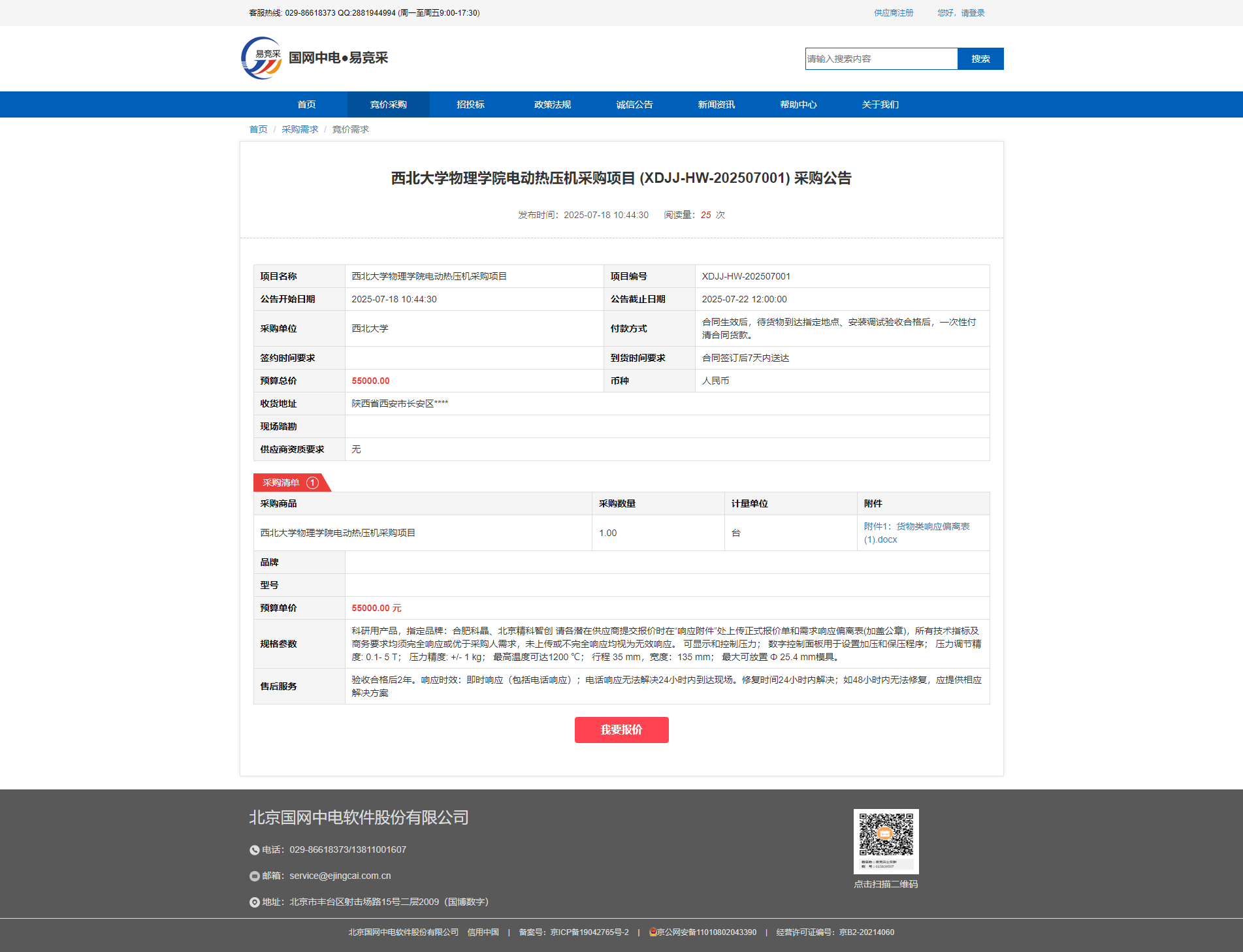 米兰网页版·官方端在线物理学院电动热压机采购项目(XDJJ-HW-202507001)竞价采购公告