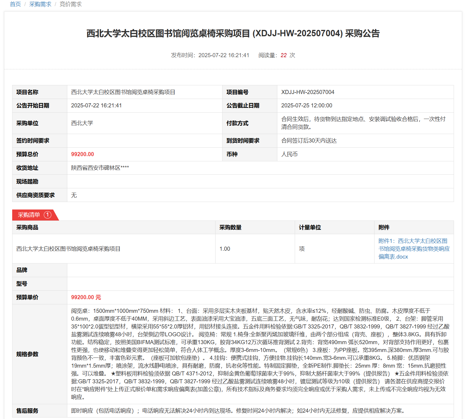 米兰网页版·官方端在线太白校区图书馆阅览桌椅采购项目(XDJJ-HW-202507004)竞价采购公告 作者:采购与招标办公室 编辑: 时间:2025-07-22 原公告链接:https://www.ejingcai.com.cn/site/bidding/detail/19667