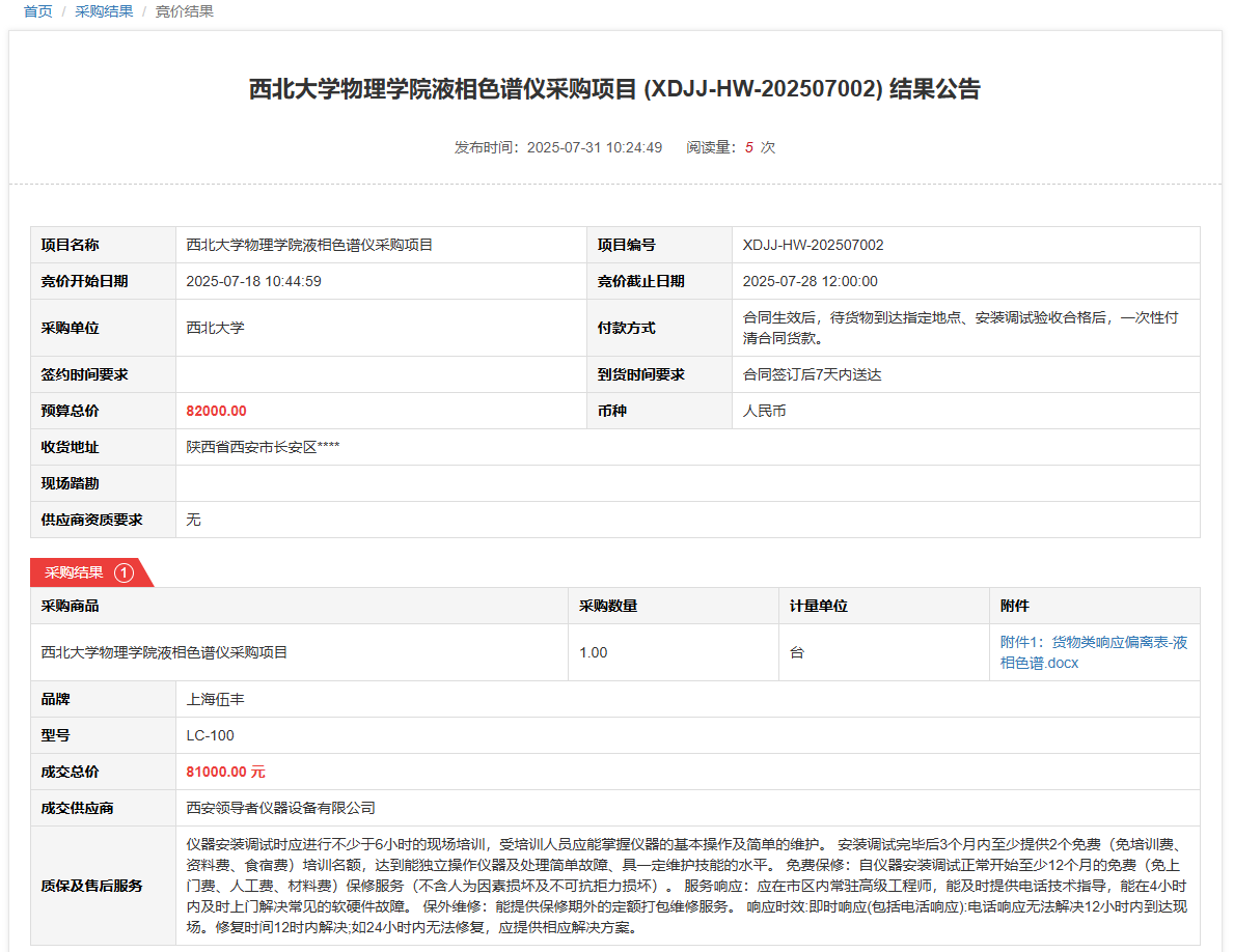 米兰网页版·官方端在线物理学院液相色谱仪采购项目(XDJJ-HW-202507002)竞价结果公告