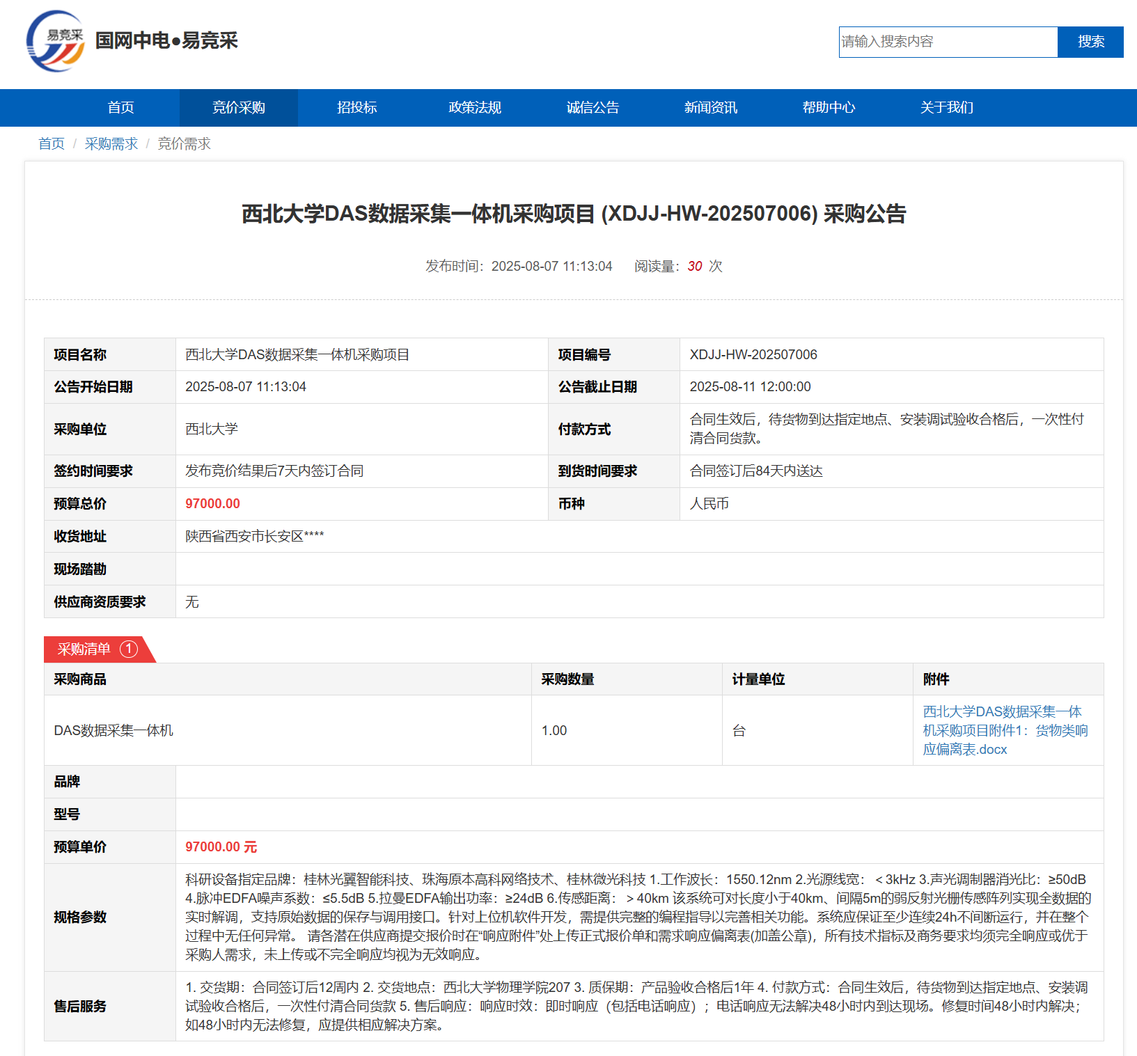 米兰网页版·官方端在线DAS数据采集一体机采购项目(XDJJ-HW-202507006)竞价采购公告