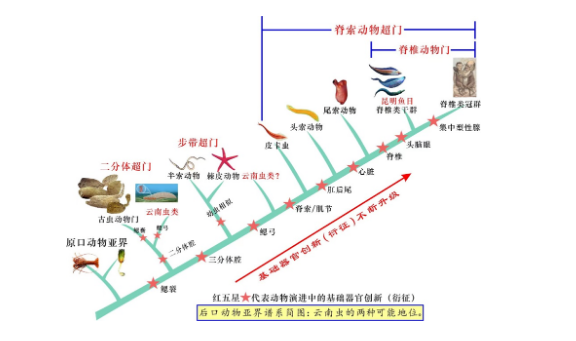 中国科学院院士、米兰网页版·官方端在线地质学系教授舒德干指出,在后口亚界谱系演进上,云南虫比脊椎动物至少低4个基础器官创新(衍征)等级(见上图)。目前脊椎动物已知唯一的干群是昆明鱼目,因为它已具有头脑眼、单鼻孔和嗅囊、原始脊椎、二分心脏、复杂肌节等无颌鱼必需的基本器官构造,所以与脊椎动物冠群的亲缘关系密切。