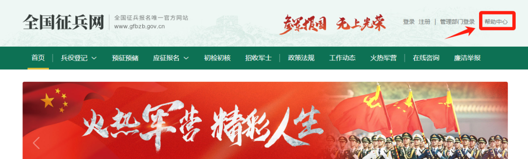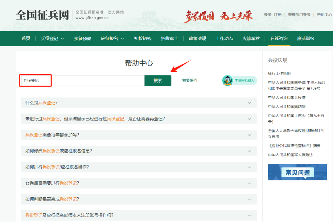 提示:有不懂的问题,可以点击全国征兵网右上角的“帮助中心” ,对各种疑问都有较为详细的解答。如搜索“兵役登记”,可获得相关解答。
